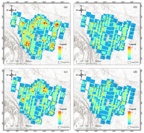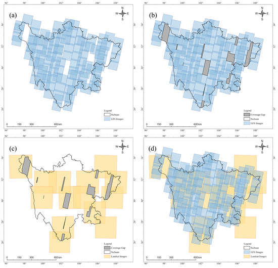 Schematic diagram of iterative selection for GF-6 and Landsat data in the Sichuan experimental area: (a) Selection results of GF-6 data; (b) coverage gaps of GF-6 data over the ROI; (c) gap-filling results using Landsat; (d) final optimal selection results.