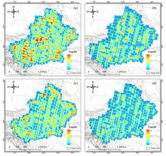 The results indicate that SCOPES exhibits significant optimization capabilities across all sampling rates. Compared to the original candidate sets after thinning, SCOPES substantially reduces the NSI. For instance, in the Xinjiang region at a 100% sampling rate, the NSI was reduced from 1961 to 355. The RR after selection is significantly lower than that of the candidate datasets, proving the algorithm’s effectiveness in eliminating overlapping areas. Furthermore, the AQS of the selected images decreases despite the drastic reduction in image count, indicating that the algorithm effectively filters for image quality. In all test scenarios, the ECR after SCOPES optimization remains perfectly consistent with the maximum coverage capacity of the candidate sets. This demonstrates that the algorithm accurately identifies and retains all marginal images contributing to spatial coverage during redundancy elimination, without sacrificing coverage accuracy for the sake of lower redundancy. At extremely low sampling rates (e.g., 5%), the optimized results were observed to be identical to the candidate sets (where NSI no longer decreases and RR approaches 0).