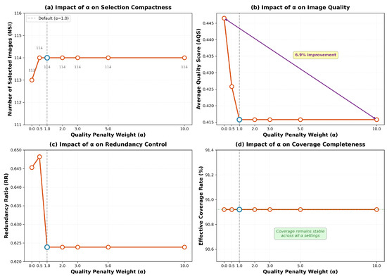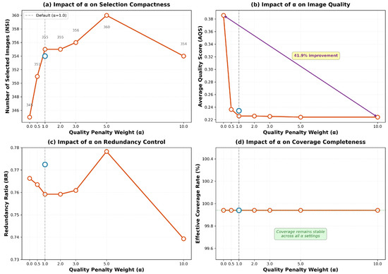where serves as the intensity adjustment for the quality penalty term and can be flexibly set according to task requirements. The construction logic of this function embodies dual optimization objectives: on the one hand, the normalized coverage score is in the denominator, encouraging the selection of images with greater spatial coverage contribution to achieve efficient coverage of the ROI; on the other hand, through the multiplicative term , an explicit penalty mechanism is introduced for image quality.