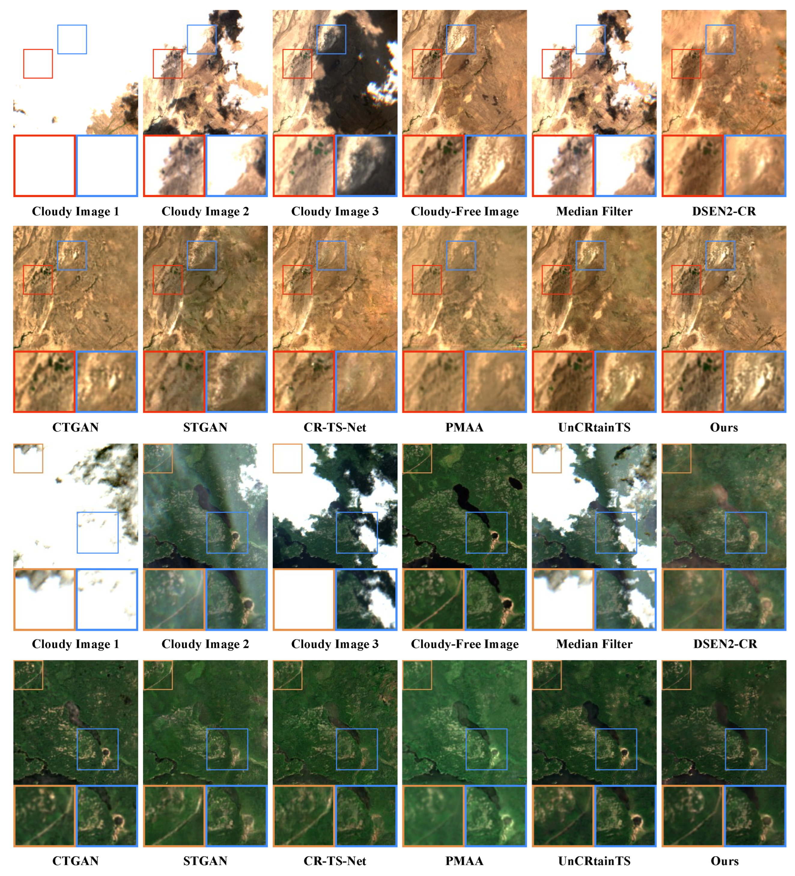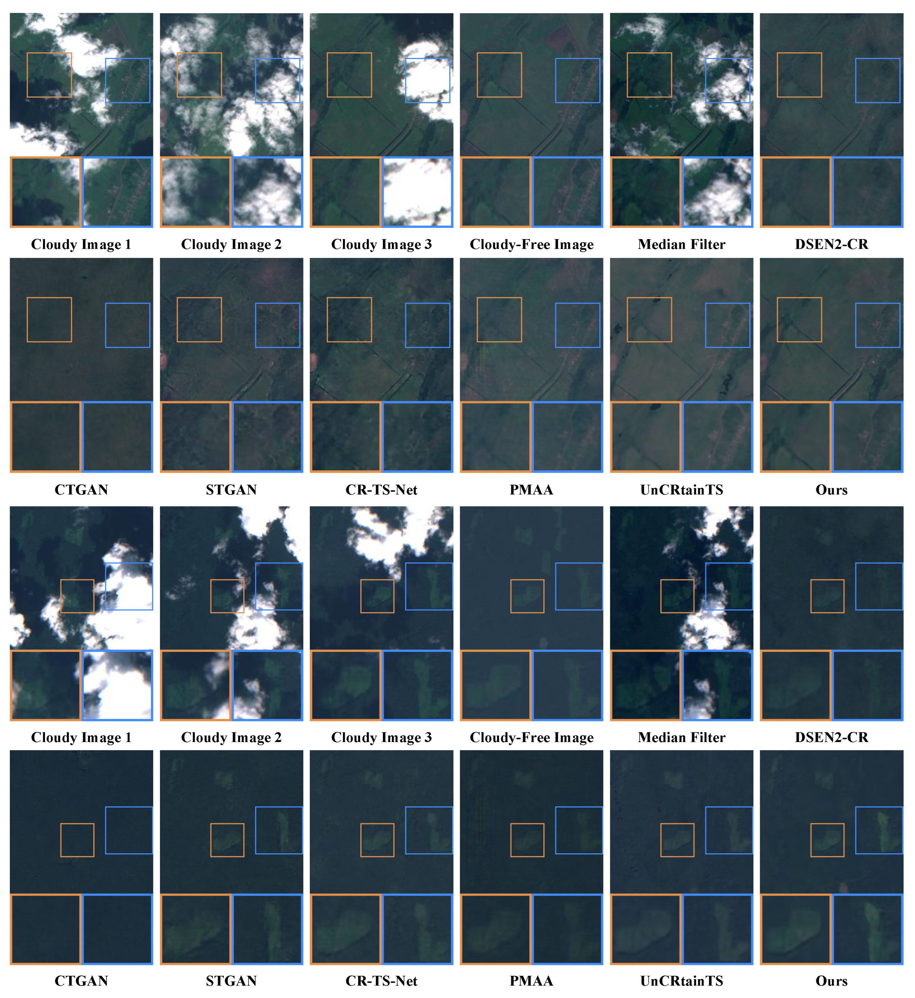 - Sen2_MTC_New is structurally similar to STGAN, comprising a total of 3417 multispectral image sequences. Each sequence also consists of three cloudy images, one cloud-free reference image, and four spectral bands. To ensure a fair comparison with previous works, we strictly adhered to the standard partitioning scheme proposed in [40] to construct the training, validation, and test sets.