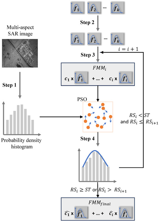 In order to investigate the potential of the FMM to precisely describe the statistical properties of the multi-aspect SAR images, our previous work proposed an FMM containing five single parametric models and applied the simulated annealing (SA) algorithm to estimate the parameters and coefficients [5]. Compared with single parametric models, this FMM has the potential to achieve better modeling performance for multi-aspect SAR images. However, this model still has two limitations. First, it fixes the number of components in the mixture and does not fully consider how the fitting performance of the FMM varies with the number of components. As a result, they may suffer from overfitting in certain cases—in other words, the fitting performance of FMM may decrease as the number of mixed single parametric models increases. Second, the parameter and coefficient estimation process of this FMM is time-consuming. Consequently, this restricts the efficiency and practicality of the FMM for multi-aspect SAR images. To thoroughly explore the influence of the number of single parametric models in the FMM on its fitting performance as well as accurately, stably, and efficiently model the statistical distribution characteristics of multi-aspect SAR images, we introduce the stepwise-regression strategy into the model selection process, proposing a stepwise-regression-based finite mixture model named SRFMM. The SRFMM first employs a voting-based ranking strategy to determine the order in which single parametric models are added to the FMM. Then it incrementally combines these models in the determined order until the desired accuracy is reached or overfitting occurs, thereby obtaining the final FMM. In the implementation of the SRFMM, we employ the particle swarm optimization (PSO) algorithm for parameter and coefficient estimation in the SRFMM, due to its robustness and parallelism.