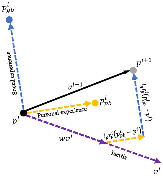 PSO is a population-based stochastic optimization algorithm proposed by Kennedy and Eberhart in 1995, originally designed to simulate social behaviors [35]. In PSO, a group of candidate solutions, called particles, iteratively explore the solution space based on their current velocities, personal bests, and the global best. Each iteration can be represented as a movement process, as illustrated in Figure 2. Each iteration updates the current solutions (represented by the position of each particle) through a combination of three components as follows: