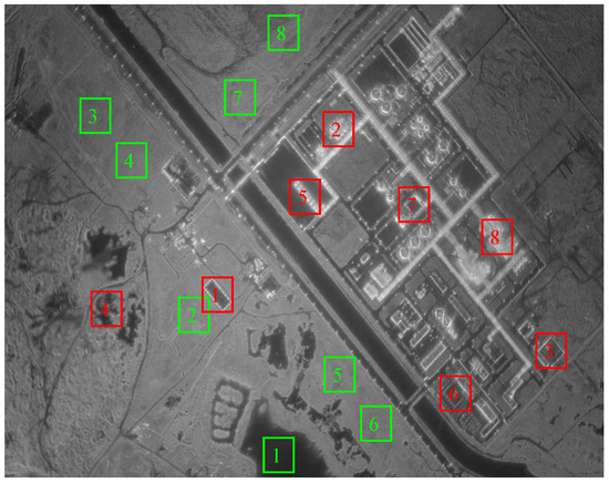 To thoroughly examine how the fitting performance changes as the number of single parametric models in the FMM increases, we selected 16 regions with a window size of 160 from the CSAR data (8 isotropic regions such as land, and 8 anisotropic regions such as building), and we then employed FMM1 to FMM5 to model these regions. Figure 5 presents the 16 selected regions from the entire scene, where the isotropic regions are enclosed by green boxes and the anisotropic regions are enclosed by red boxes. The enlarged full-aperture CSAR images of these selected regions are shown in Figure 6. These regions are selected as they basically cover the typical targets in the whole scene.