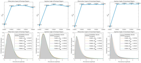 As shown in Figure 7, the average adjusted R-squared values across observation aspects and aperture angles increase from FMM1 to FMM3 for the isotropic regions and from FMM1 to FMM4 for the anisotropic regions, respectively. This indicates that the fitting performance of these FMMs improves as the number of mixed single parametric models increases. However, after adding the other single parametric model(s) (i.e., FMM4 and FMM5 for isotropic regions and FMM5 for anisotropic regions), the fitting performance deteriorates on the contrary. This result indicates that, initially, the fitting performance of the FMM improves as more single parametric models are added. However, too many models lead to overfitting and a reduction in fitting performance. (RQ-1). To provide an intuitive illustration of how the fitting performance varies with the number of mixture components (FMM1-FMM5), the fitting curves of the models with different numbers of components for the probability density histogram are illustratively presented beneath the line chart in each corresponding situation. As shown in the examples, for the isotropic region, the fitting performance improves as the number of single parametric models increases from FMM1 to FMM3, but it starts to decline after FMM4. For the anisotropic region, the performance improves from FMM1 to FMM4, and it then decreases when the last single parametric model (i.e., FMM5) is added. These trends are consistent with the variation of the average fitting results as the number of models changes.