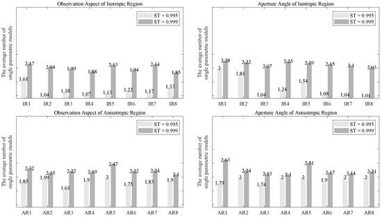 To illustrate how the desired accuracy (i.e., the second threshold, , introduced in Section 2.3) affects the number of single parametric models mixed in the FMM, we selected the following two values: 0.995 and 0.999, for this experiment. The values can be adjusted according to user requirements. We selected these two values because they can represent relatively low and high accuracy, allowing for a comprehensive evaluation of the SRFMM. For each value, we applied the SRFMM to model the 16 regions selected from the CSAR data (8 isotropic regions and 8 anisotropic regions), as described in Section 3.2. Then, we calculated the average number of single parametric models mixed in the FMMs over all observation aspects and aperture angles for each isotropic region and anisotropic region. Figure 8 shows the average number of single parametric models of the SRFMM in different regions with different values.