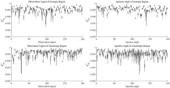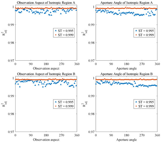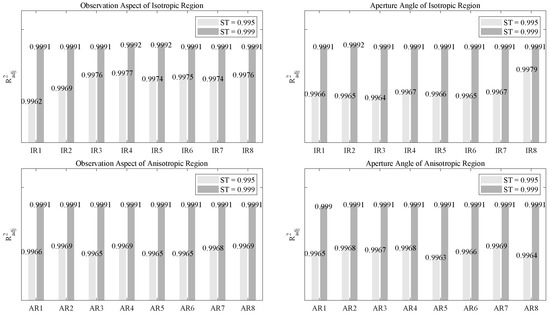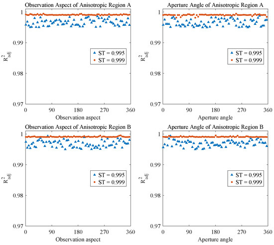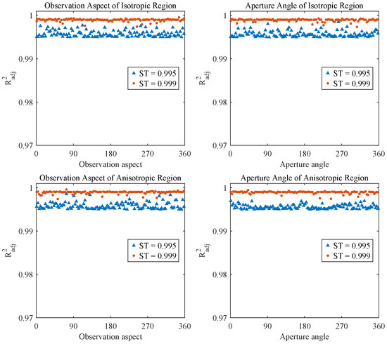 Besides, we calculated the average adjusted R-squared values of the fitting results over all observation aspects and aperture angles for each isotropic region and anisotropic region. The average fitting results of the SRFMM for different regions with different values are shown in Figure 9.
