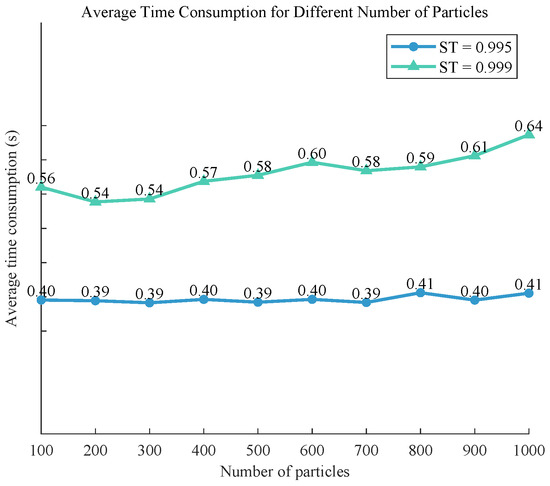 To further demonstrate the efficiency of the PSO algorithm due to its parallelism, we have calculated the average time consumption under different numbers of particles. Figure 16 shows the average time consumption for different numbers of particles with different values.