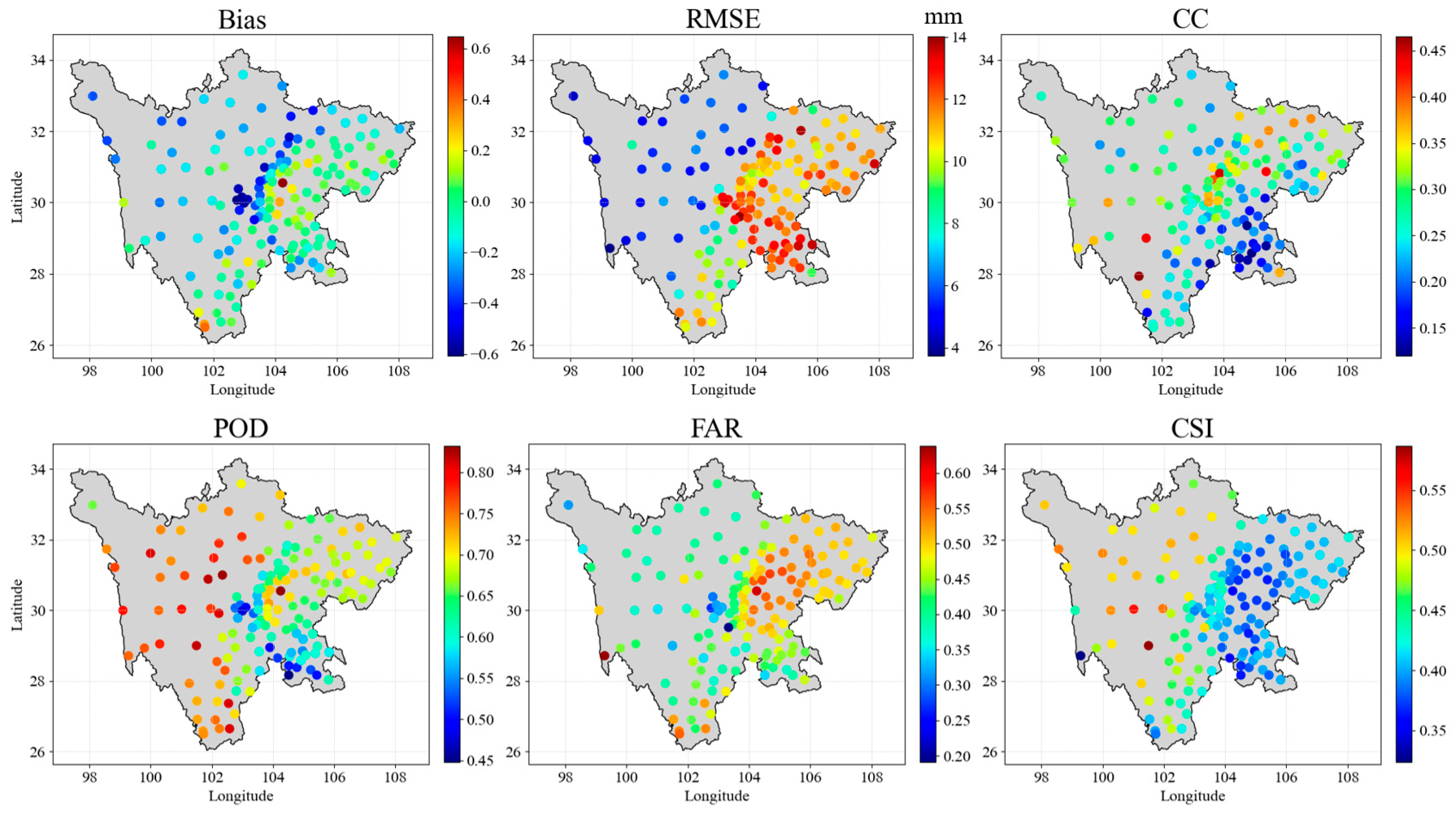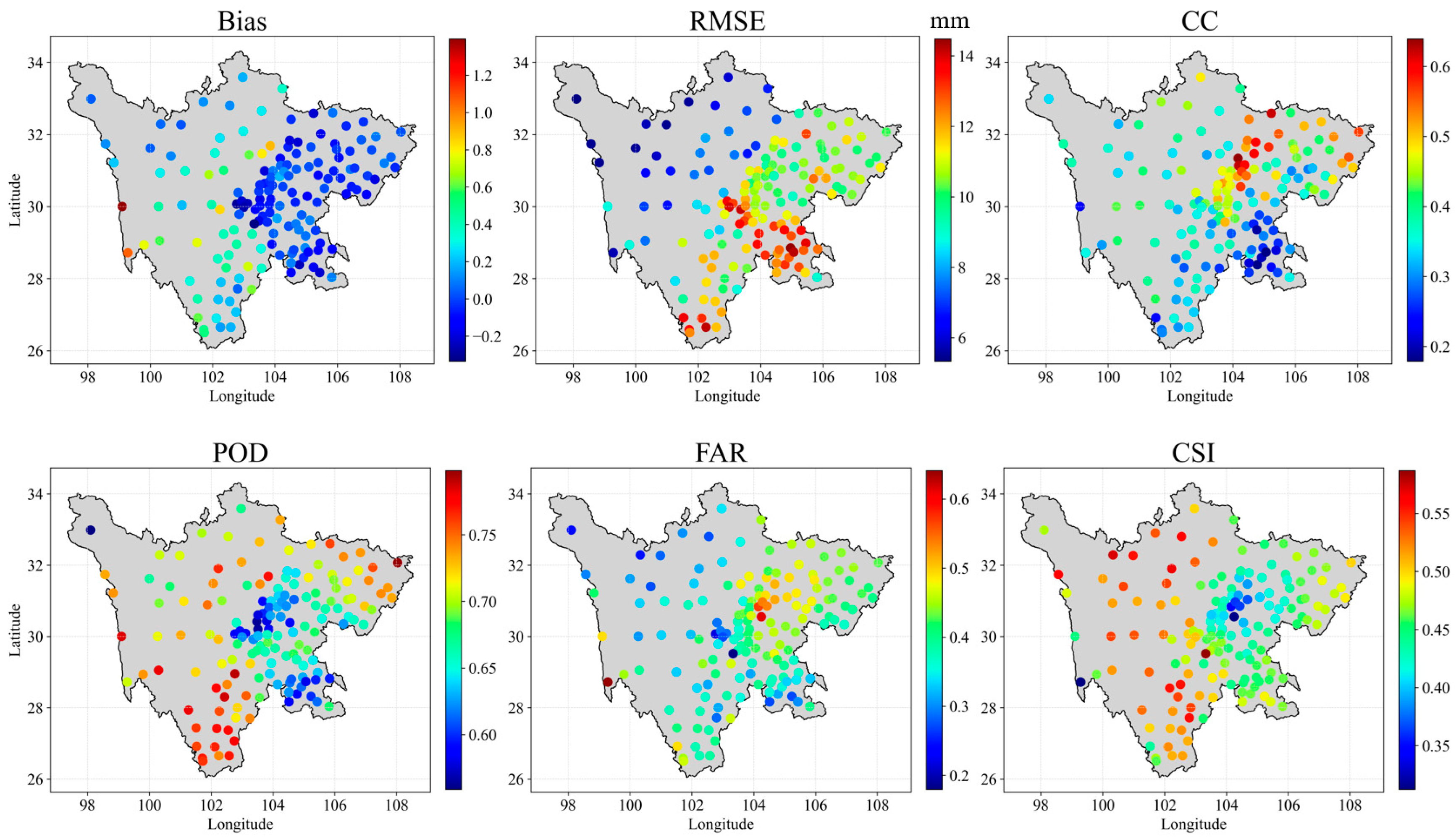 - At the spatial scale, the fused product generally exhibits reduced bias and RMSE and more homogeneous spatial patterns compared with the two original products, particularly over complex terrain. The detection metrics (POD, FAR and CSI) indicate that the fused dataset has higher POD and slightly improved CSI, and that the spatial distribution of detection skill becomes more uniform across the province. FAR remains at a relatively high level and is comparable to that of the original products, implying that the main gain of the fusion lies in enhanced event sensitivity and spatial consistency, rather than in substantially reduced false alarms.