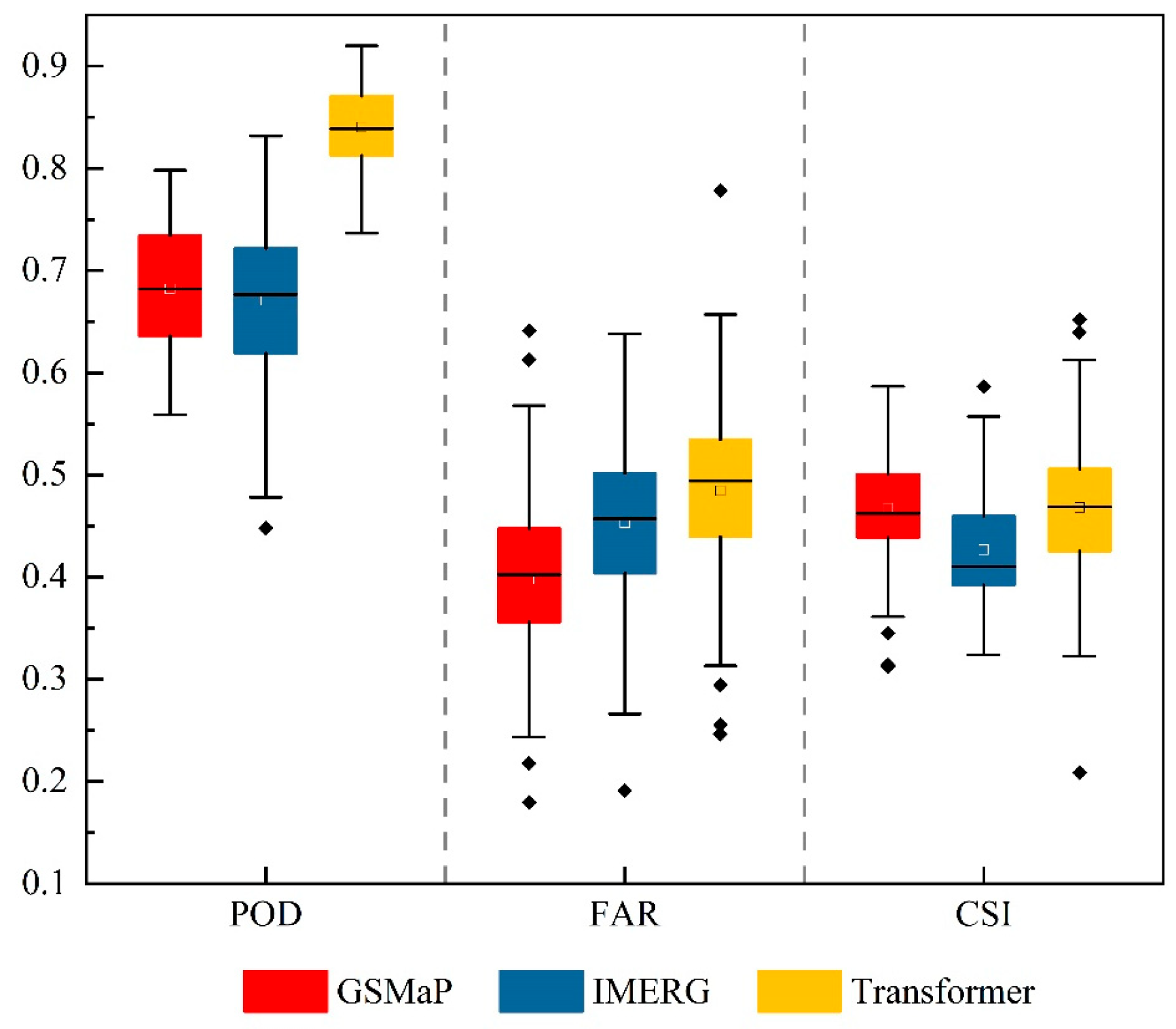 | Daily-scale | GSMaP | 0.72 | 6.24 | 3.62 |