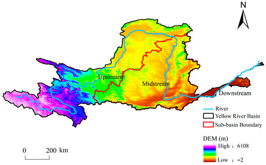 The Yellow River Basin is located between 32°10′–41°50′N and 95°53′–119°05′E (Figure 1). It stretches westward from the Bayan Har Mountains in Qinghai Province, eastward to the Bohai Sea, northward to the Yin Mountains, and southward to the Qinling Mountains. Extending approximately 1900 km from east to west and 1100 km from north to south, it covers a total area of approximately 795,000 km2 [35]. The basin is divided into the upper, middle, and lower reaches, separated by Hekou Town in Togtoh County, Inner Mongolia Autonomous Region, and Taohuagu in Zhengzhou City, respectively. The terrain slopes from west to east. In the west, there is a series of high mountains with an average altitude exceeding 4000 m. The central part features loess landforms with relatively severe soil erosion, at an altitude ranging from 1000 to 2000 m. The eastern part is an alluvial plain with an altitude of ≤100 m [36]. The basin features a continental monsoon climate, with an arid climate in the northwest, a semi-arid climate in the central part, and a semi-humid climate in the southeast. Precipitation mainly occurs from June to September. Most areas receive an annual precipitation ranging from 200 to 650 mm, and the average annual temperature is between −4 and 14 °C [22,35]. The Yellow River Basin has recently encountered challenges, including land desertification, severe soil erosion, vegetation degradation, aggravated water pollution, and runoff reduction. These factors present substantial constraints to the sustainable development of the basin’s ecological environment [10,31].