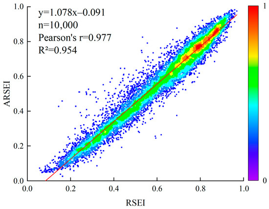 The inclusion of the soil erosion factor (A) is the core improvement of the ARSEI model, which significantly enhances its responsiveness to key ecological constraints within the basin. This enhancement is particularly evident in the accurate identification of areas characterized by high vegetation cover but severe soil erosion. The traditional RSEI model may produce overly optimistic assessments in such regions due to high vegetation greenness, overlooking the ecological risks associated with soil loss. The spatial distribution comparison in Figure 2 provided intuitive evidence. In areas with high soil erosion intensity, such as the northern Loess Plateau, the RSEI evaluation resulted are mostly rated as “moderate” and “poor,” whereas the ARSEI resulted assign lower ecological grades in these regions, such as “Fair” and “poor.” This indicates that ARSEI, by incorporating the impact of soil erosion, appropriately reduces the ecological environment quality scores in areas characterized by “high greenness and severe erosion.” This “reduction” is not a model bias but rather a more accurate reflection of the actual state of the ecosystem, highlighting ARSEI’s sensitivity in identifying potential ecological degradation risks. The Pearson correlation coefficient between ARSEI and RSEI reached as high as 0.977 (P < 0.01), with the scatter points closely distributed along both sides of the fitted line and the slope of the fitted line exceeding 1 (Figure 3). This demonstrates the effectiveness and consistency of the improvement. In summary, ARSEI can comprehensively, accurately, and effectively assess the ecological environment quality of the Yellow River Basin, providing a more reliable basis for precise evaluation and risk management of ecological environment quality in the Yellow River Basin and other similar regions.