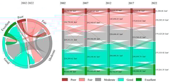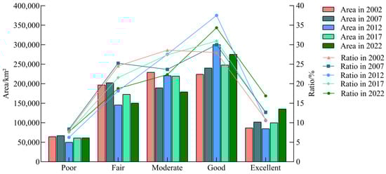 The study determined that the mean ARSEI in the Yellow River Basin from 2002 to 2022 followed a pattern of “initial increase, slight decline, and subsequent increase,” indicating an overall upward trend with fluctuations. This shows that the ecological environment quality in the Yellow River Basin has generally improved over the past two decades. These findings are consistent with those of Dong et al. [60], primarily owing to the government’s intensified efforts since the late 20th century to manage the Yellow River Basin. Key ecological restoration projects such as the Three-North Shelterbelt Program, Grain for Green Program, and soil and water conservation have been actively implemented in the region. However, from 2012 to 2017, the ecological environment quality in the Yellow River Basin showed a declining trend, which is consistent with the findings of Yin Chuanxin [55]. This decline may have resulted from factors such as climate change, water resource shortage, intensified soil erosion and sediment deposition, as well as increased industrialization, urban expansion, and excessive exploitation of water resources during this period. in 2019, General Secretary Xi Jinping convened the ecological protection and high-quality development of the Yellow River Basin symposium and elevated the ecological protection and high-quality development of the Yellow River Basin as part of a national strategy [61]. The Yellow River Basin underwent systematic restoration efforts, resulting in an improvement in the basin’s ecological environment by 2022.
