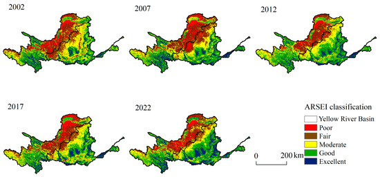 Table 6 presents the PCA results for each ecological indicator from 2002 to 2022. During the five-year period, the eigenvalue contribution rate of PC1 exceeded 70%, indicating that PC1 integrated most characteristics of the five ecological indicators. In PC1, NDVI and WET had positive loads, whereas NDBSI, LST, and A had negative loads. This indicates that NDVI and WET contributed positively to ecological environment quality, whereas NDBSI, LST, and A exerted a negative effect, which is consistent with the actual conditions. Therefore, in this study, the use of PC1 was reasonable to construct the ARSEI model for evaluating the ecological environment quality of the Yellow River Basin.