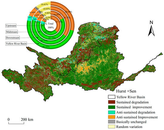 The variation trend of the ARSEI in the Yellow River Basin indicated a coexistence of both improvement and degradation, with the area showing an improvement trend exceeding that of the degradation trend. The most notable improvement trend was observed in the middle reaches of the basin. The ARSEI coefficient of variation analysis revealed that 75.74% of the basin area experiences moderate or lower levels of fluctuation, indicating relatively low overall variability and strong stability. These results are consistent with previous studies [55,63], highlighting the significant contributions made by the government to ecological restoration in the Yellow River Basin. The Hurst index and Theil–Sen slope revealed that the future trend of ecological environment quality in the basin is expected to be predominantly positive, consistent with the findings of Chen et al. [30]. However, 35.12% of the area remains at risk of future degradation, particularly in regions such as Qinghai, Gansu, and Inner Mongolia. Therefore, efforts toward ecological protection and high-quality development in the Yellow River Basin remain a long-term and demanding endeavor.