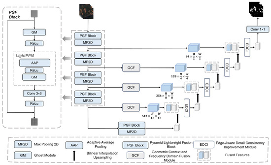 Overall architecture of the proposed GCF-Net. The network adopts a U-shaped encoder–decoder structure, which consists of PGF Block, GCF, and EDCI.
