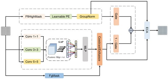 The architecture of the proposed GCF module is illustrated in Figure 2, which consists of two complementary branches. Branch A is designed to enhance boundary and fine-scale structures by exploiting frequency-domain characteristics. According to spectral analysis theory, edge and texture information is predominantly encoded in high-frequency components. Given the input feature map , we first project it into a latent representation X through a convolution: