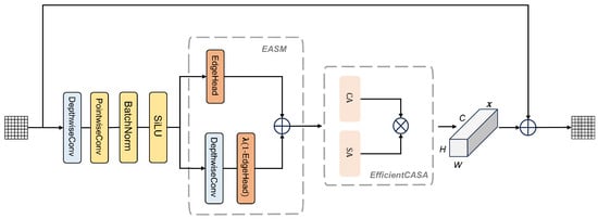 where represents the input feature map; H, W, and C indicate the feature map height, width, and number of channels, respectively; DepthwiseConv and PointwiseConv indicate the depthwise separable convolution and pointwise convolution operations, respectively; and ; ⊙ denotes element-wise multiplication; implies the learnable smoothing coefficient; refers to the weighted feature map obtained through this approach; EfficientCASA signifies the efficient channel-spatial attention module; represents the feature map processed by this module; refers to the residual; and indicates the final output feature map after fusion.