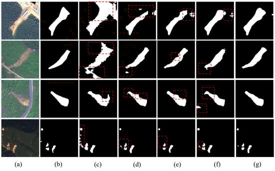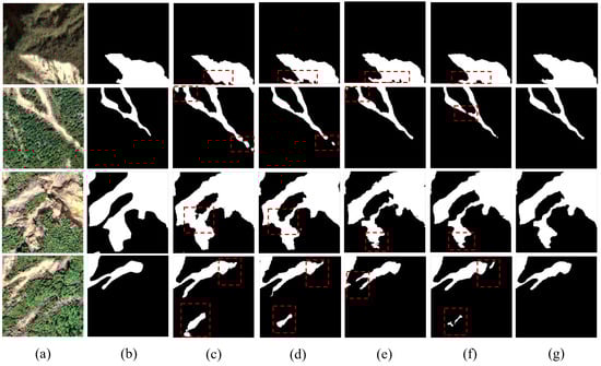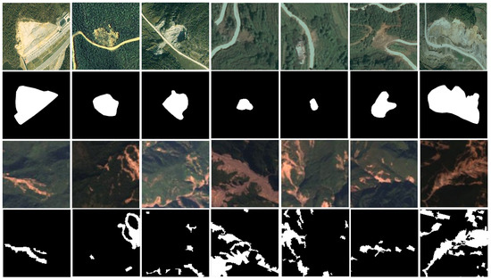The experimental dataset, referred to as the Hybrid Dataset, integrates data from two distinct sources: the Bijie City dataset and the INSAR landslide dataset. The Bijie dataset, captured by TripleSat satellites from May to August 2018, consists of 770 high-resolution (0.8 m) raw images characterized by pronounced topographic relief and abundant rainfall. The INSAR dataset encompasses 3799 raw images derived from diverse global geomorphologies, primarily acquired by Sentinel-2 satellites with resolutions ranging from 10 m to 60 m. In total, the Hybrid Dataset comprises 4569 raw images. Representative samples, corresponding ground truth maps, and visualization results are illustrated in Figure 4.