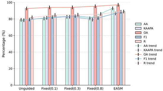 To quantify the effect of the Edge-Adaptive Smoothing Module (EASM) on segmentation performance, five key segmentation metrics were selected on the Hybrid dataset to compare the performance of the fixed edge guidance strategies (thresholds 0.1, 0.3, 0.8) with the proposed EASM, and the results were plotted as a grouped bar chart, as shown in Figure 11. Compared with the fixed edge guidance strategies, the EASM achieved superior performance across all five metrics: Overall Accuracy (OA), Average Accuracy (AA), Kappa, Recall (R), and F1-score. Although the fixed edge guidance strategies could marginally improve some metrics, their overall effectiveness was limited by their inability to adapt to the spatial heterogeneity of boundary confidence. This limitation is particularly prominent in practical applications: the boundary features of landslide terrains exhibit significant variability, and fixed parameters often fail to adapt to the diverse gradients of boundary features. In contrast, the proposed EASM adaptively modulates the edge enhancement intensity via a learnable smoothing coefficient, prioritizes high-frequency regions and small target regions, and effectively improves the restoration of edge details, while ensuring robust adaptability to varying terrain conditions. The results of the grouped bar chart with trend lines also clearly demonstrate that the EASM exhibits superior performance across all metrics.