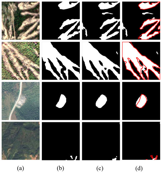 Visualization of typical failure cases. The columns represent: (a) original images, (b) ground truth, (c) prediction results, and (d) overlay analysis. In column (d), the red outlines denote the ground truth, and the white fills denote the predicted landslides.