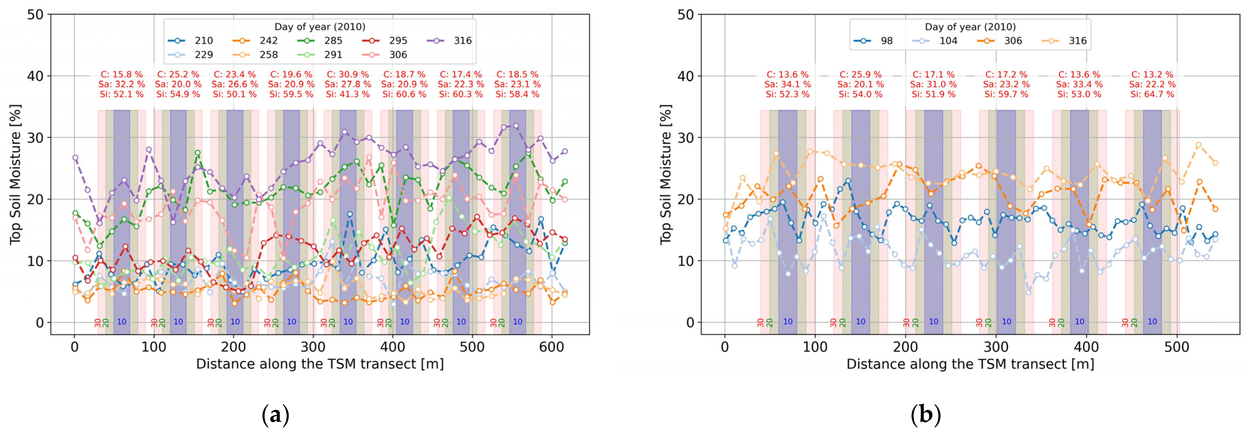 - Vereecken, H.; Huisman, J.A.; Pachepsky, Y.; Montzka, C.; Van Der Kruk, J.; Bogena, H.; Weihermüller, L.; Herbst, M.; Martinez, G.; Vanderborght, J. On the Spatio-Temporal Dynamics of Soil Moisture at the Field Scale. J. Hydrol. 2014, 516, 76–96. [Google Scholar] [CrossRef]
