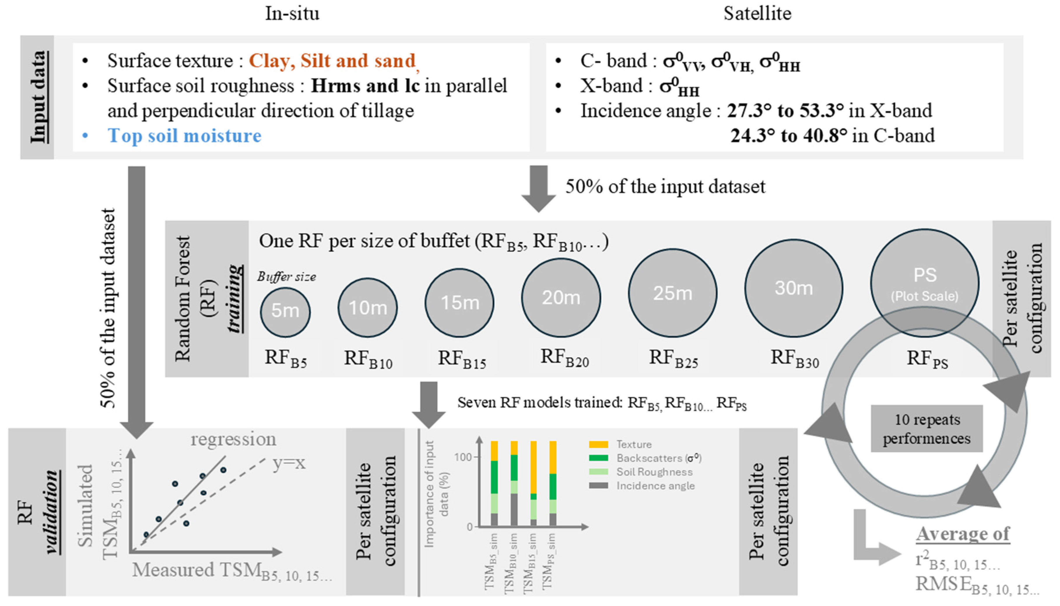 - Dabboor, M.; Xu, O.J.; Vakalopoulou, M.; Bélair, S.; Powers, J.; Carrera, M.; Sun, L. The RADARSAT Constellation Mission for Soil Moisture Retrieval of Bare Soil by Compact Polarimetry and Random Forest Regression: La Mission de La Constellation RADARSAT Pour l′estimation de La Teneur En Eau de Sols Nus Par Polarimétrie Compacte et de La Régression Random Forest. Can. J. Remote Sens. 2024, 50, 2356688. [Google Scholar] [CrossRef]