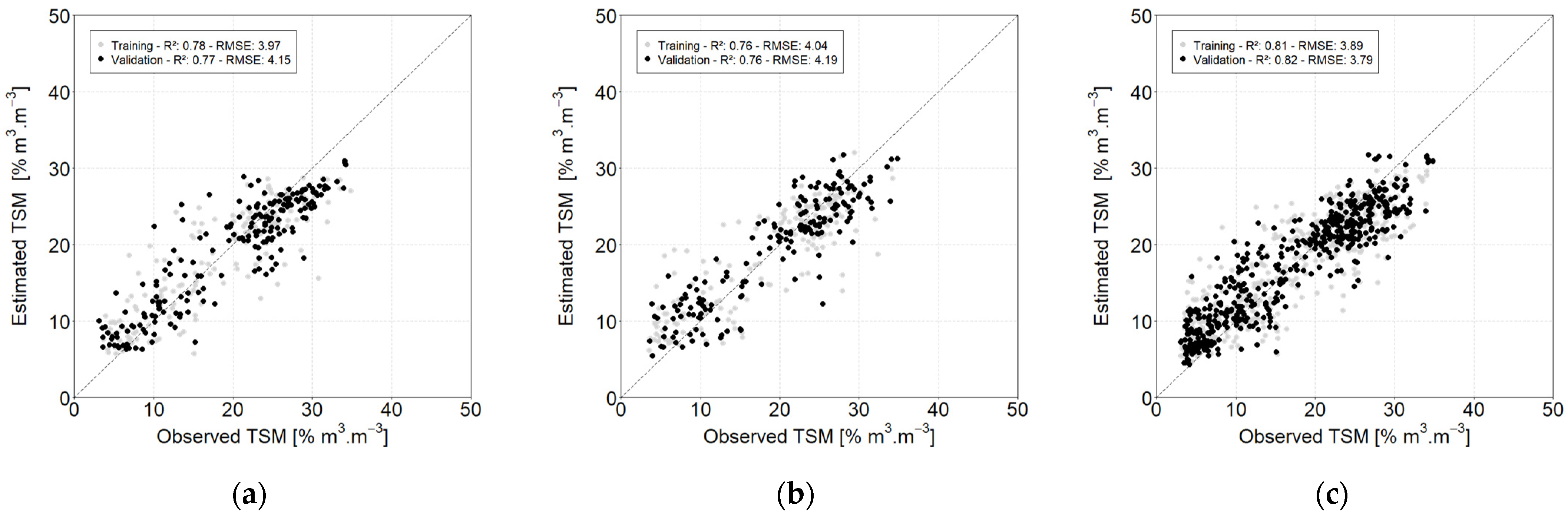 - Greifeneder, F.; Notarnicola, C.; Wagner, W. A Machine Learning-Based Approach for Surface Soil Moisture Estimations with Google Earth Engine. Remote Sens. 2021, 13, 2099. [Google Scholar] [CrossRef]