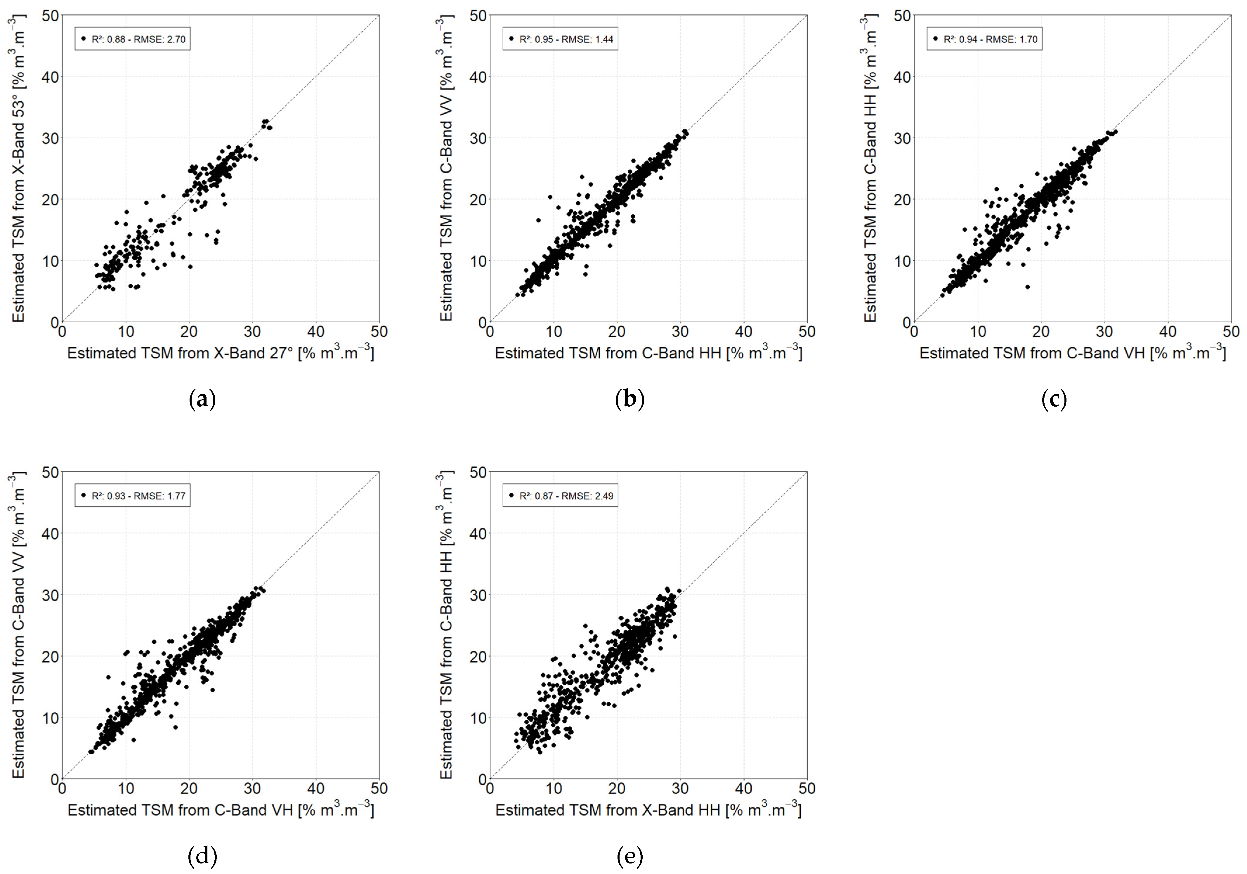 - Fieuzal, R.; Baup, F. Estimation of Multi-Frequency, Multi-Incidence and Multi-Polarization Backscattering Coefficients over Bare Agricultural Soil Using Statistical Algorithms. Appl. Sci. 2023, 13, 4893. [Google Scholar] [CrossRef]