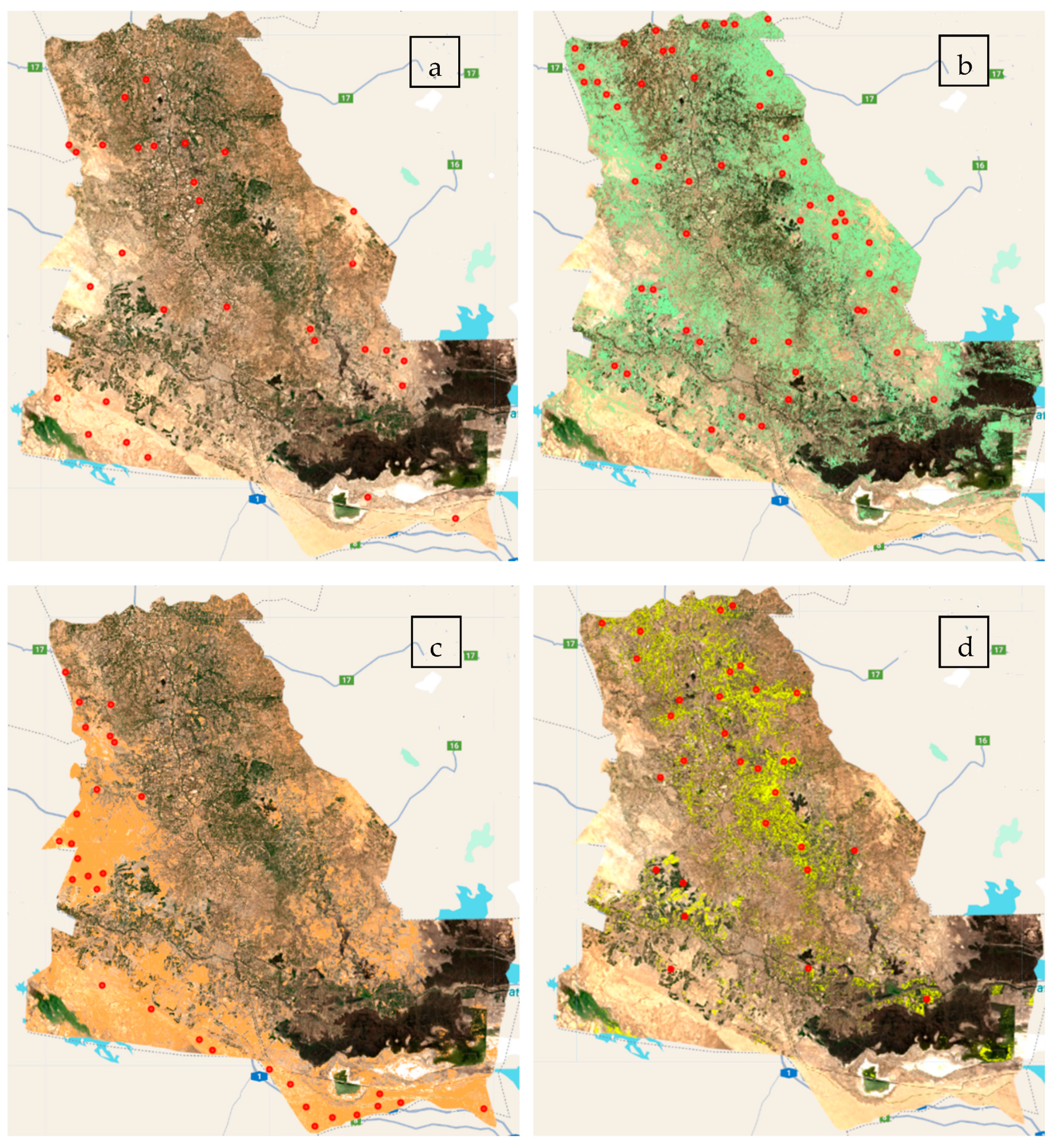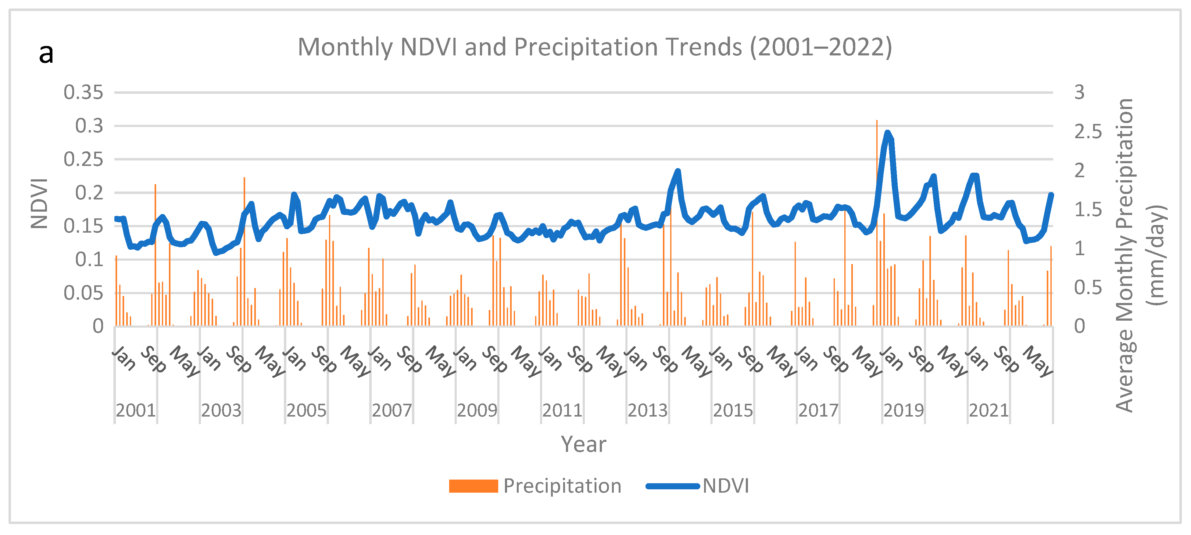 - Anwer, H.A.; Mohamed, T.; Hassan, A. Assessing Vegetation Dynamics in Al Jazirah, Sudan using NDVI-based Remote Sensing Techniques. J. Saudi Soc. Agric. Sci. 2025, 24, 18. [Google Scholar] [CrossRef]