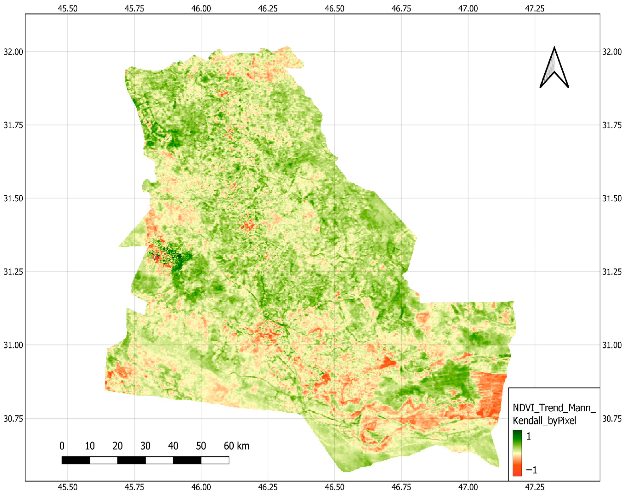 - Over half (56.5%) of Thi-Qar’s vegetation cover showed a decrease from 2001 to 2022, showing widespread degradation.
