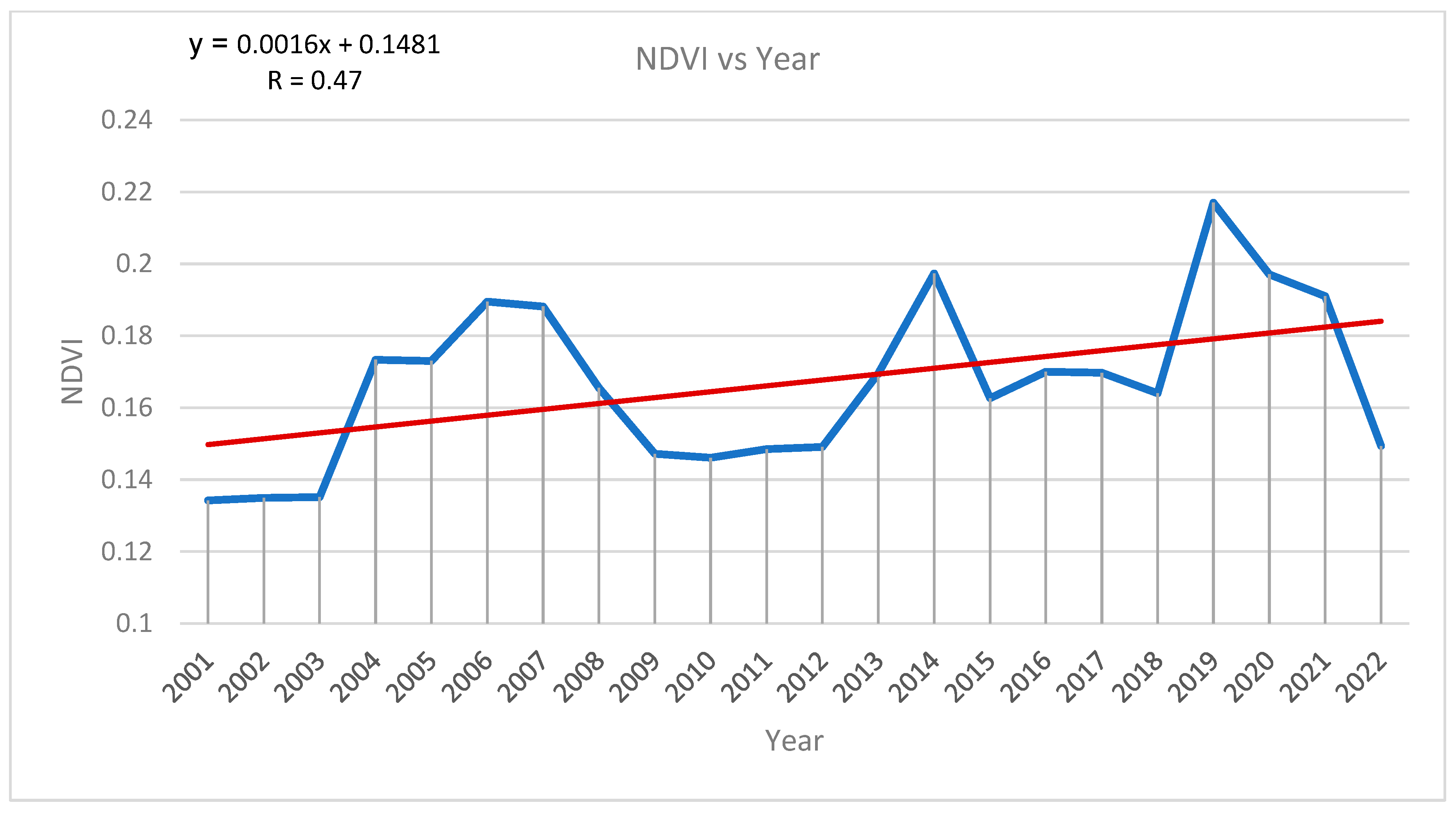 - Regression analysis showed that the NDVI was influenced more by streamflow than by LST or rainfall.