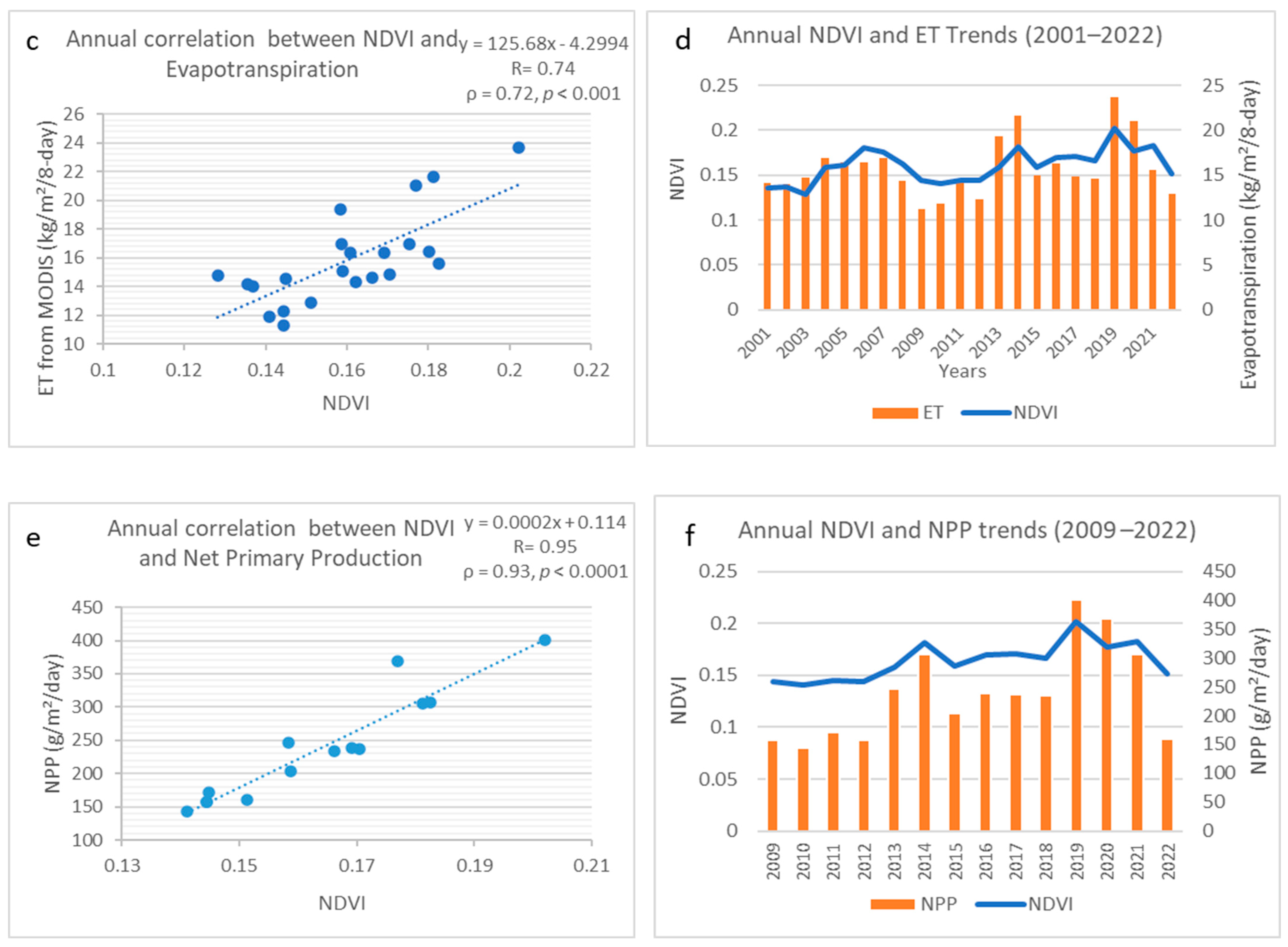 - This study presents a replicable model for monitoring the effects of hydrological–climatic interactions on vegetation cover in similar arid places around the globe.