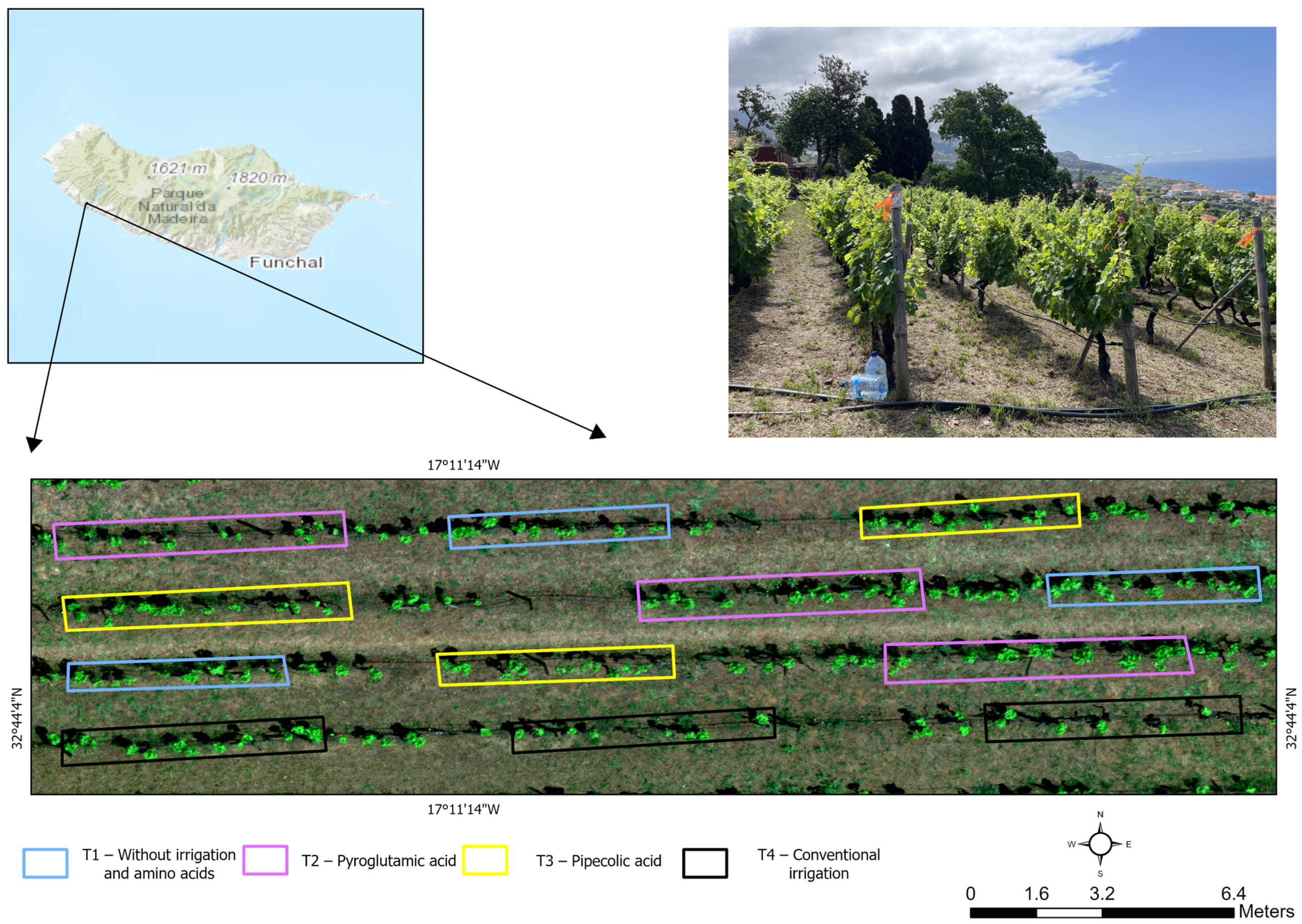 Macedo FL, Ragonezi C, Ganança JFT, Nóbrega H, de Freitas JGR, Borges AA, Jiménez-Arias D, Pinheiro de Carvalho MAA. The Application of Amino Acids as a Sustainable Strategy for Managing Water Stress in Vineyards. Remote Sensing. 2026; 18(4):641. https://doi.org/10.3390/rs18040641
