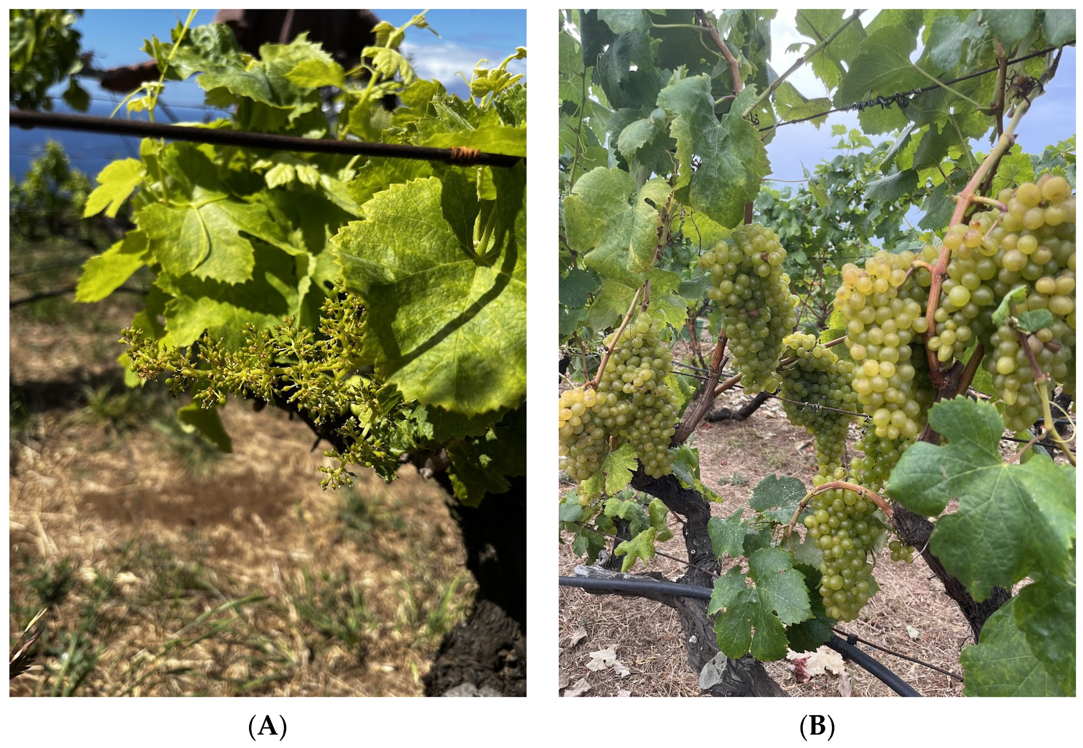 - Lorenz, D.; Eichhorn, K.; Bleiholder, H.; Klose, R.; Meier, U.; Weber, E. Growth Stages of the Grapevine: Phenological Growth Stages of the Grapevine (Vitis vinifera L. ssp. vinifera)—Codes and Descriptions According to the Extended BBCH Scale. Aust. J. Grape Wine Res. 1995, 1, 100–103. [Google Scholar] [CrossRef]