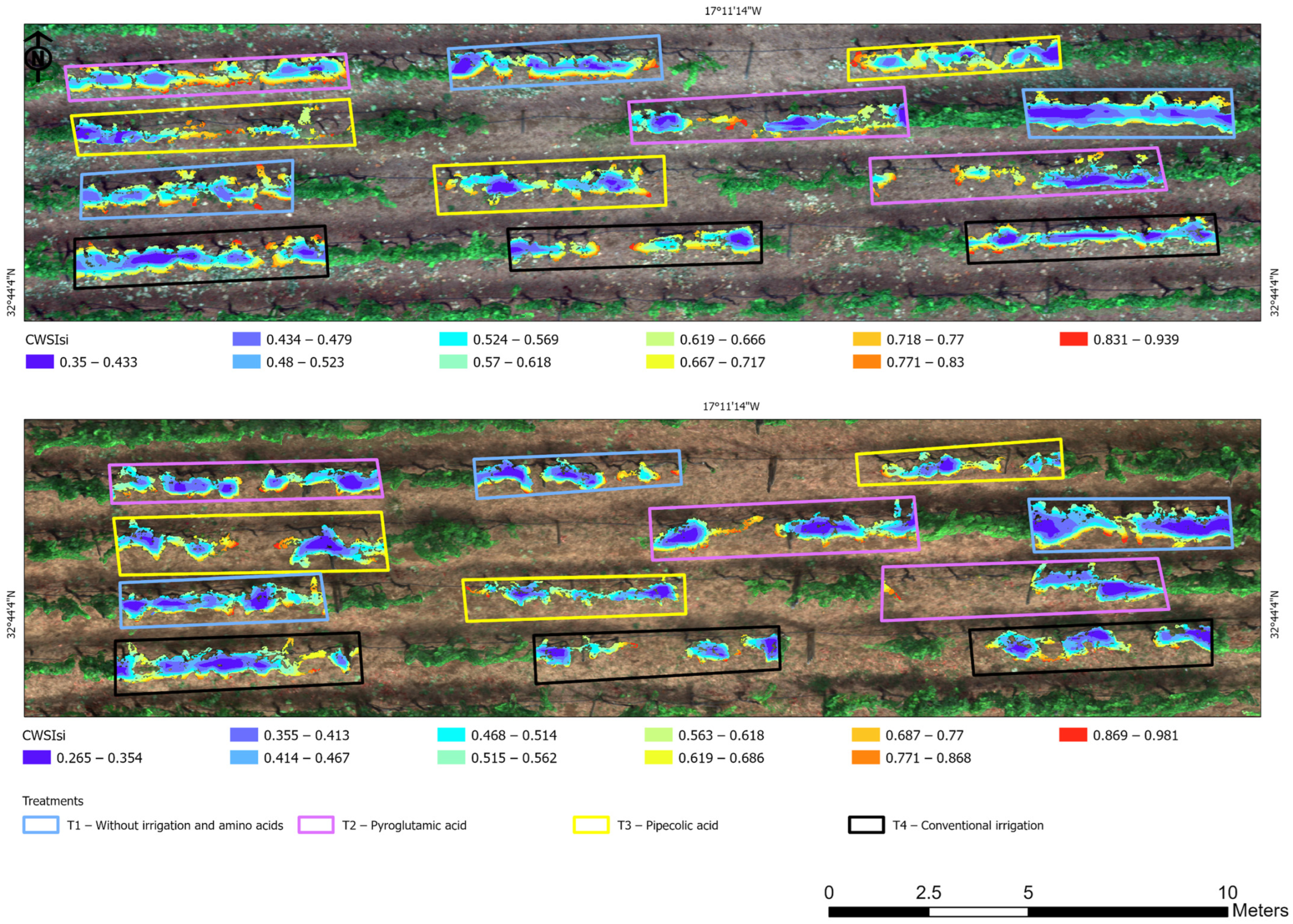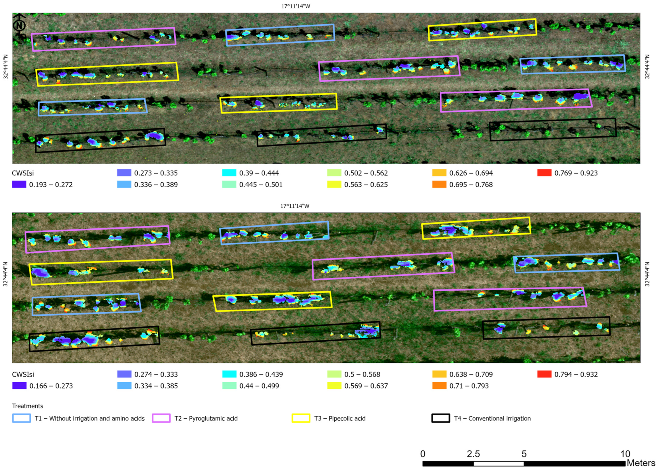 - UAV-derived multispectral and thermal indices successfully captured grapevine vigor and water stress responses to amino acid-based biostimulants under contrasting drought conditions.