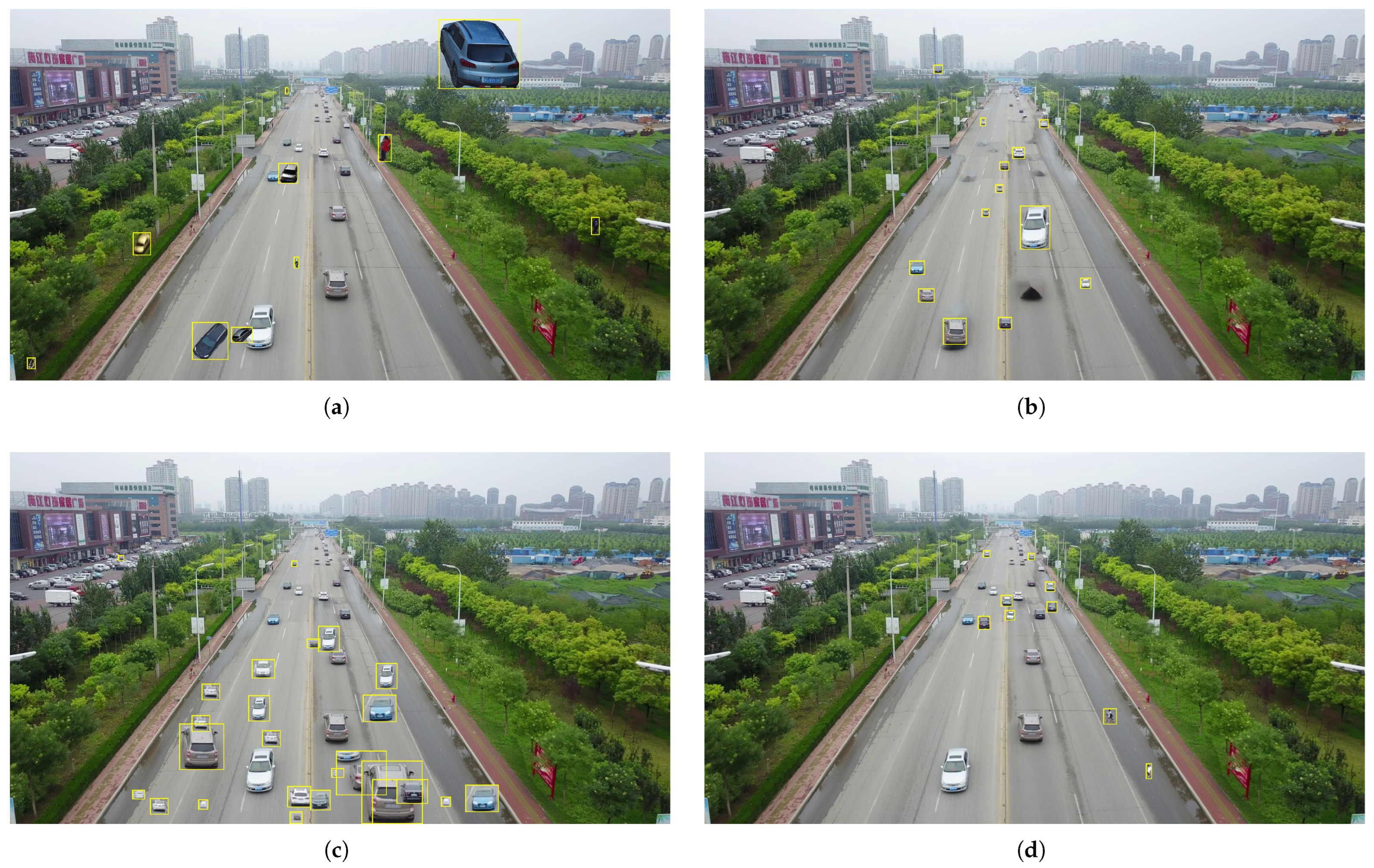 - Under the top-down view, where variations in scale and viewpoint are minimal, intra-image augmentation methods (e.g., AdaResampling [30] and InstaBoost [35]) can produce visually realistic images. In contrast, cross-image augmentation methods (e.g., Cut–Paste–Learn [37]) exhibit noticeable mismatches in both scale and viewpoint.