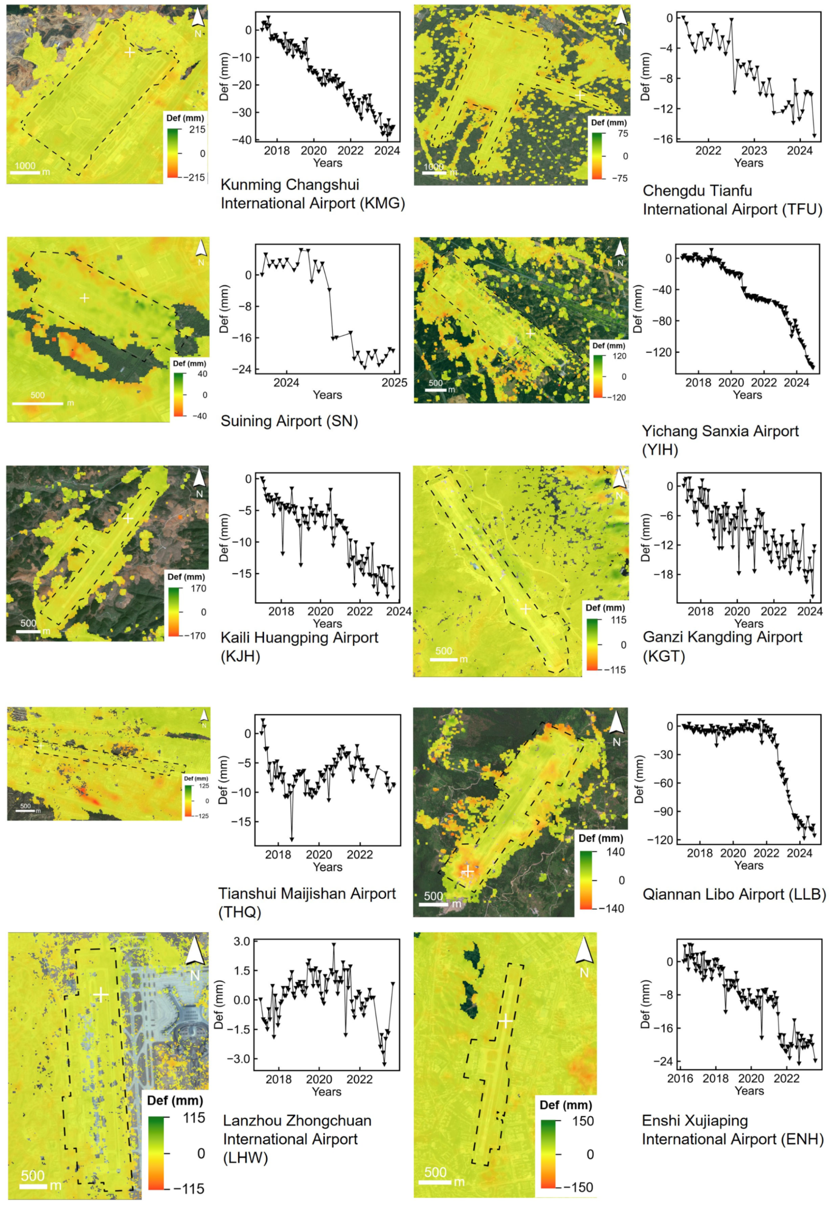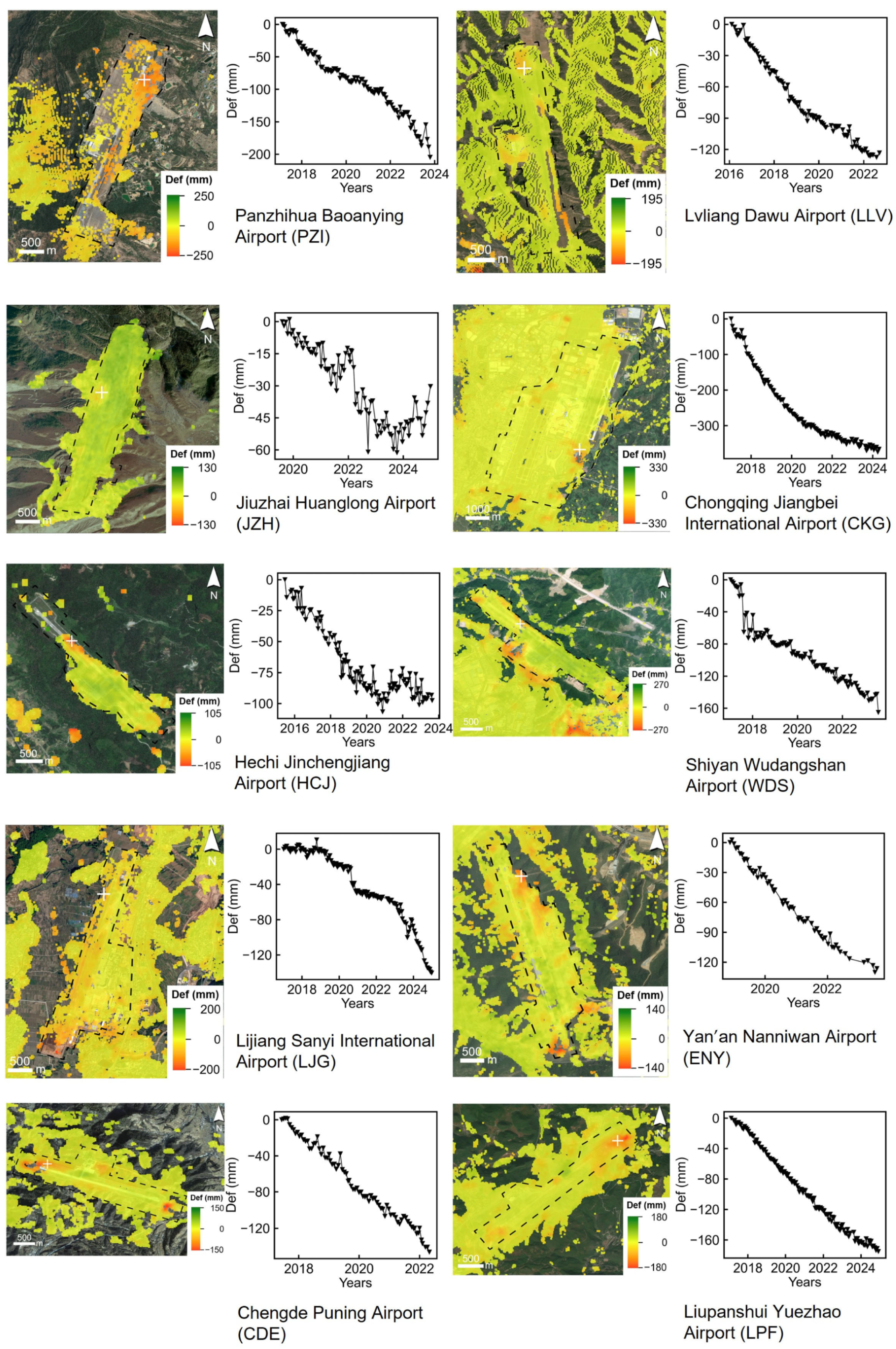 - Wen, M.; Yang, M.; Zhao, X.; Zhao, Z. Postconstruction Deformation Characteristics of High-Fill Foundations of Kunming Changshui International Airport Using Time-Series InSAR Technology. IEEE J. Sel. Top. Appl. Earth Obs. Remote Sens. 2024, 17, 206–218. [Google Scholar] [CrossRef]