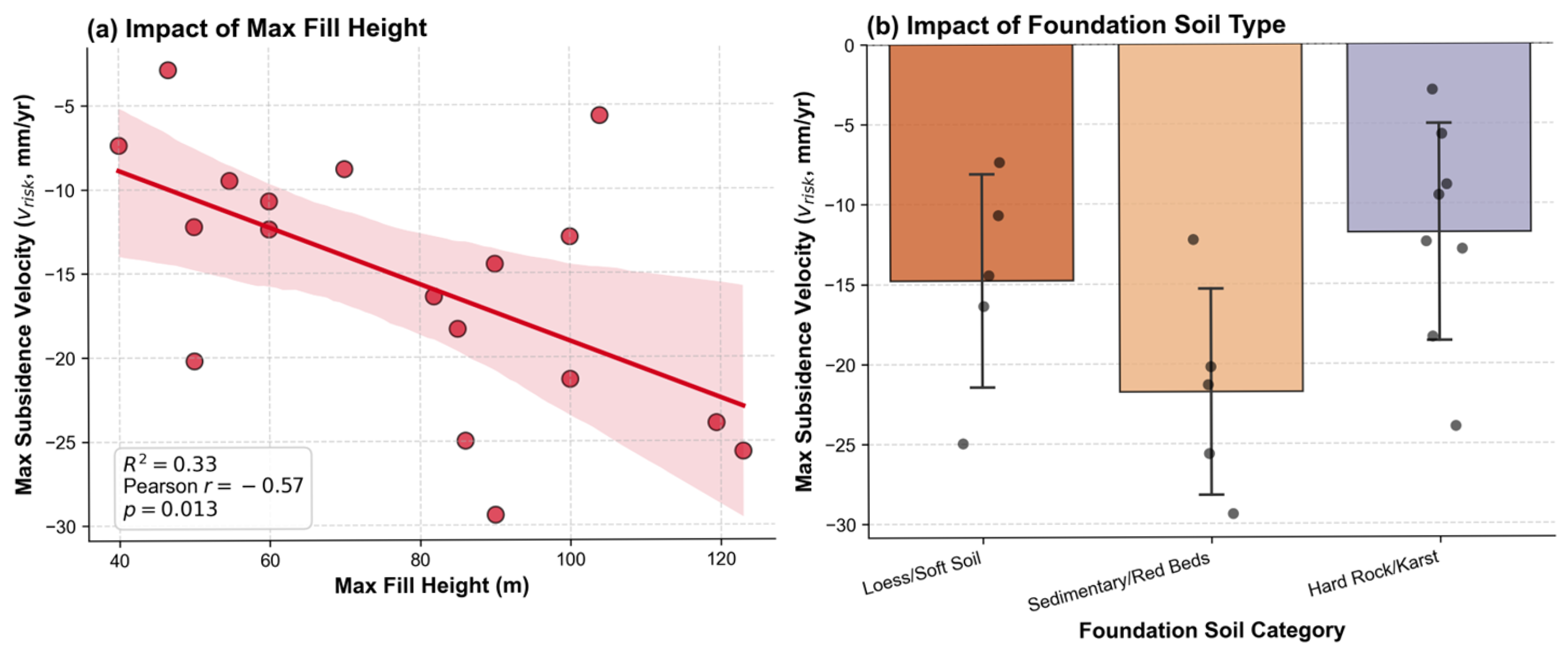 - Geological conditions exert a non-linear control on deformation: red-bed soft rocks accelerate subsidence due to water-induced slaking, while Karst geology causes extreme spatial heterogeneity.
