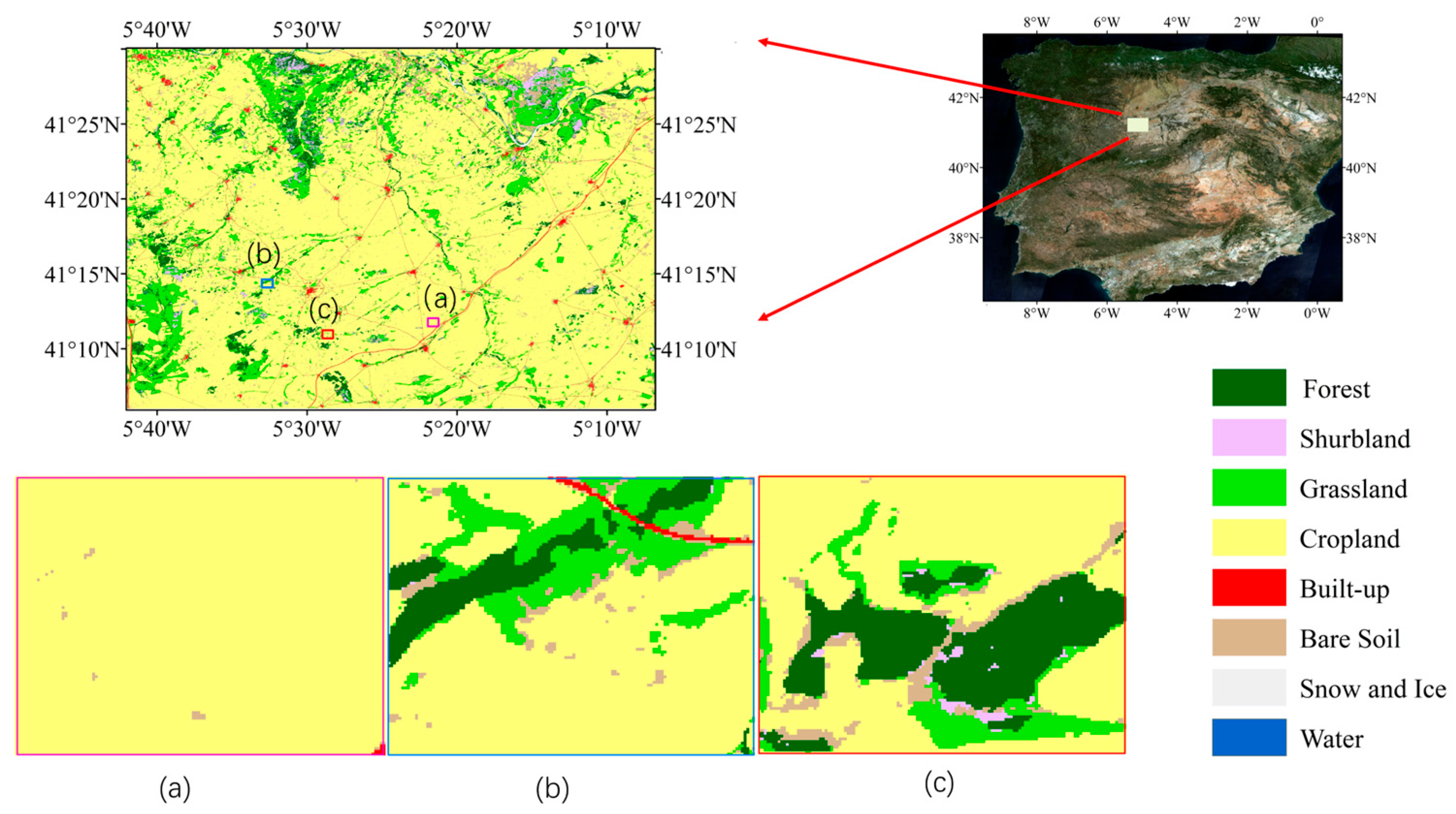 | (b) Zamarron | −5.54427, 41.23923 | 2020–2024 | A mixed landscape with small forest and shrubland patches and large cropland areas |