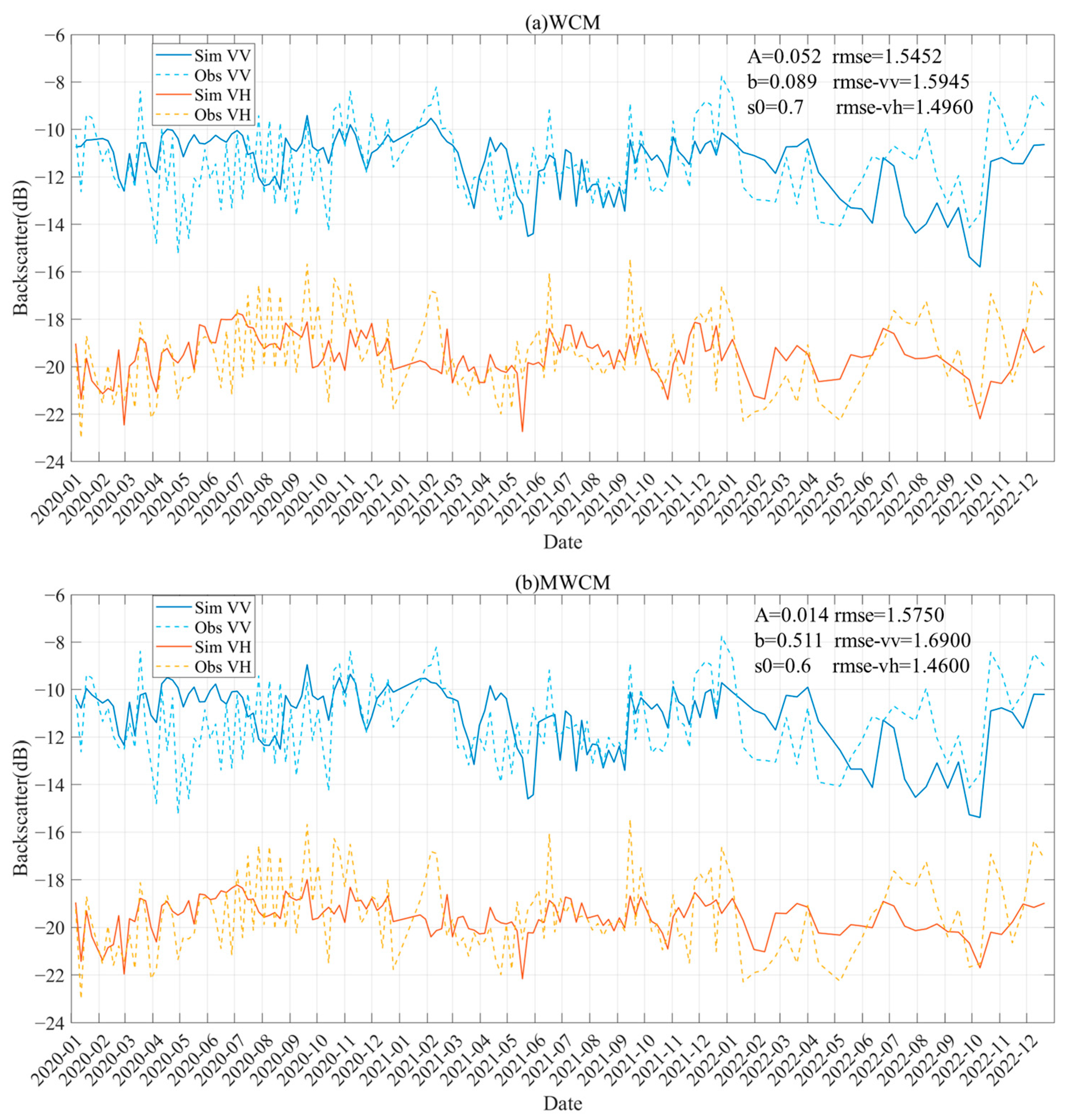 - Park, S.E.; Jung, Y.T.; Cho, J.H.; Moon, H.; Han, S.H. Theoretical Evaluation of Water Cloud Model Vegetation Parameters. Remote Sens. 2019, 11, 894. [Google Scholar] [CrossRef]