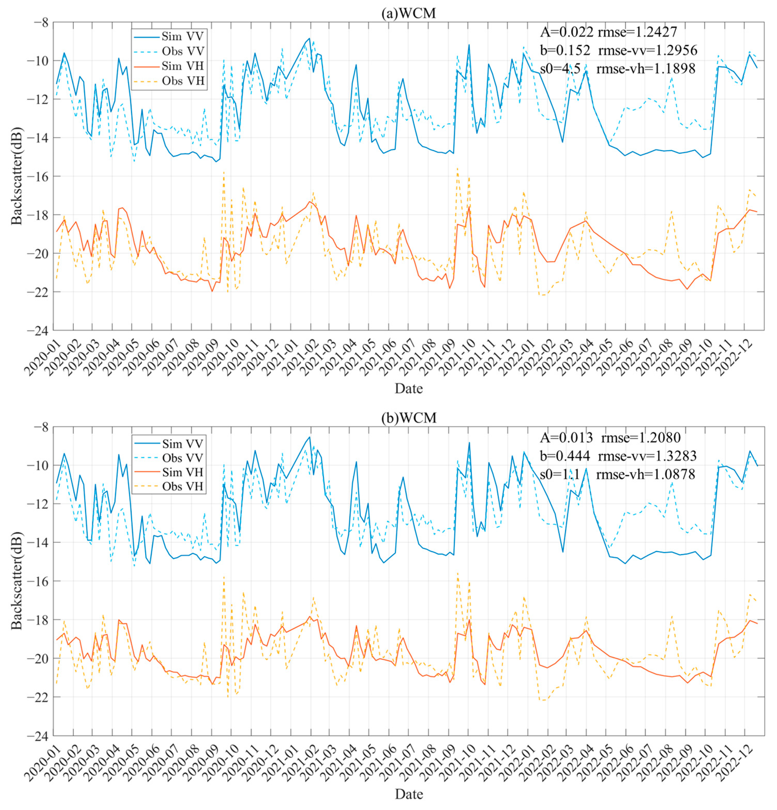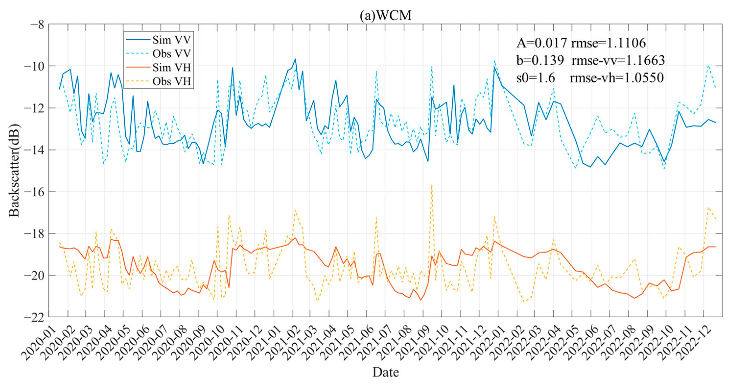 - Bai, X.; Zheng, D.; Liu, X.; Fan, L.; Zeng, J.; Li, X. Simulation of Sentinel-1A observations and constraint of water cloud model at the regional scale using a discrete scattering model. Remote Sens. Environ. 2022, 283, 113308. [Google Scholar] [CrossRef]