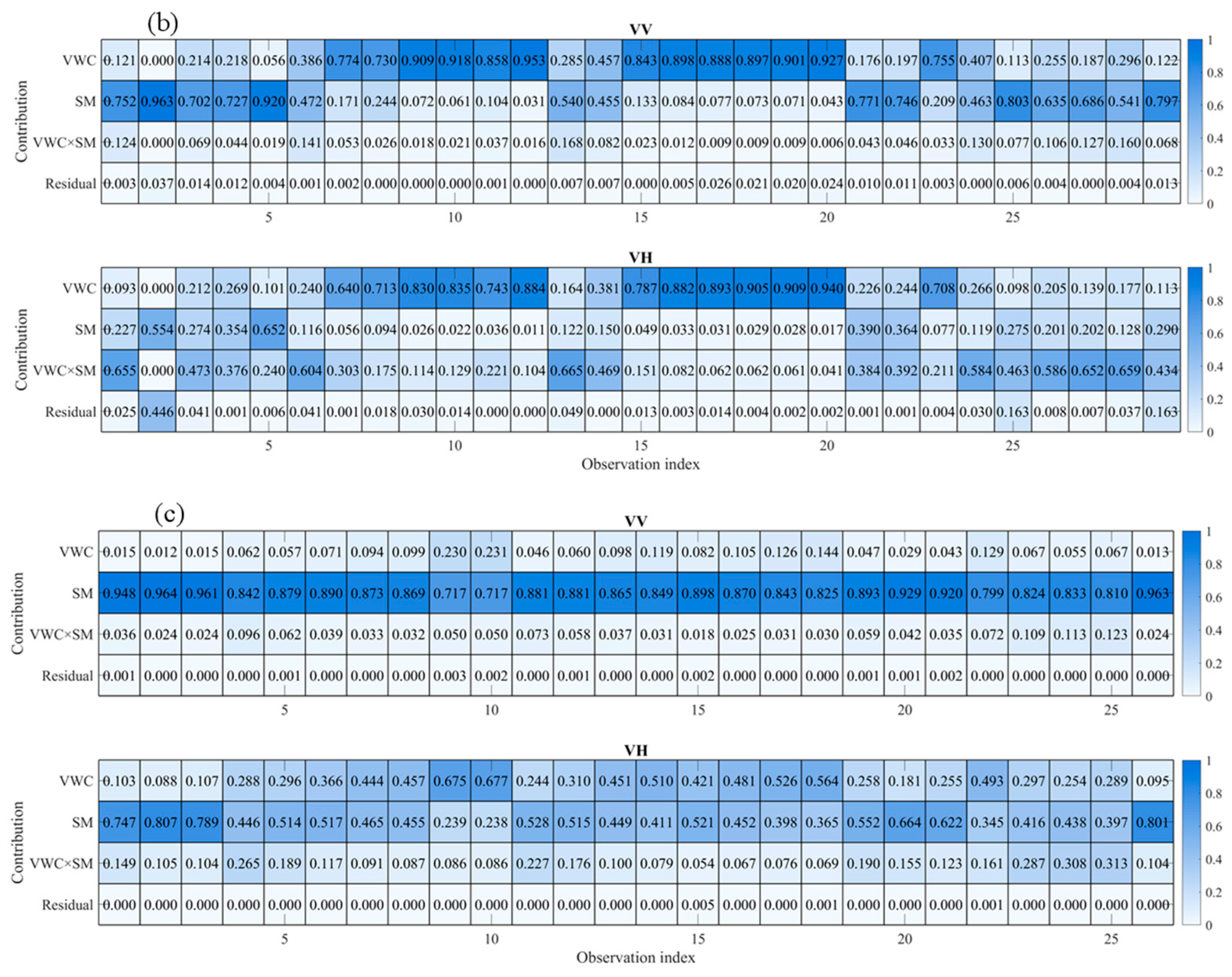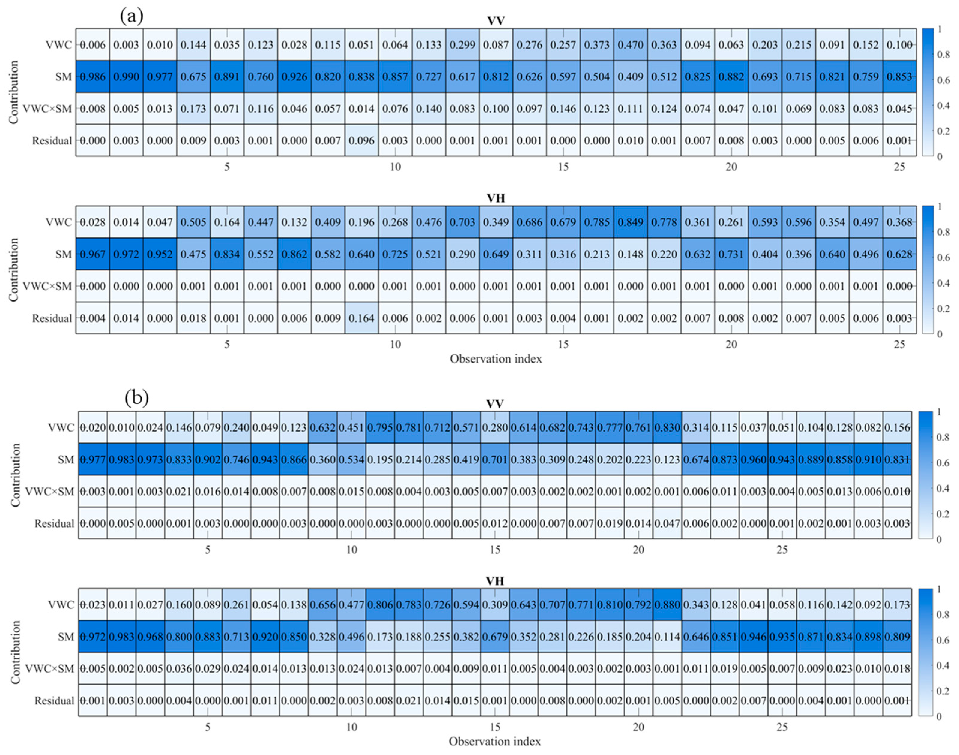 - Soil moisture retrieval in areas with varying vegetation cover should explicitly account for soil–vegetation interaction scattering to avoid systematic bias in SAR-based estimates.