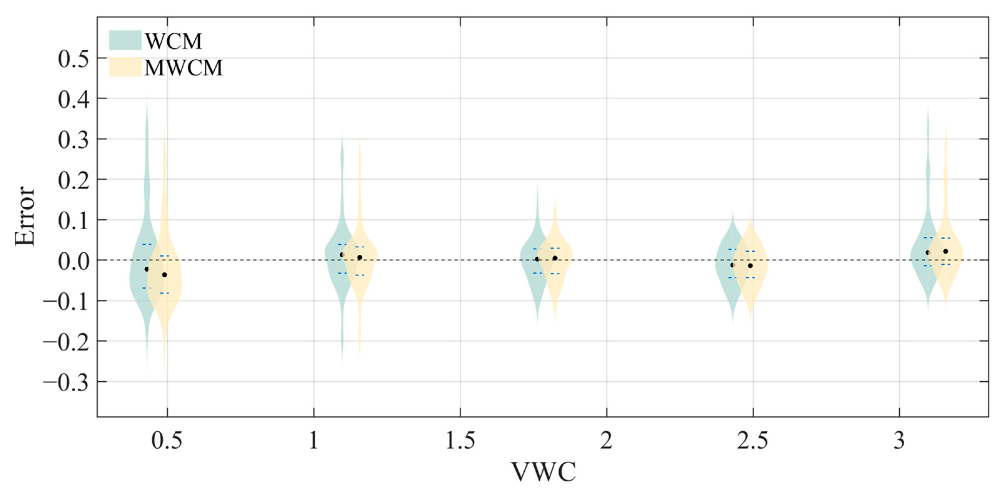 4.3. Analysis of Differences in Backscatter Simulation Soil Moisture Retrieval Accuracy Under Different Vegetation Cover Levels
