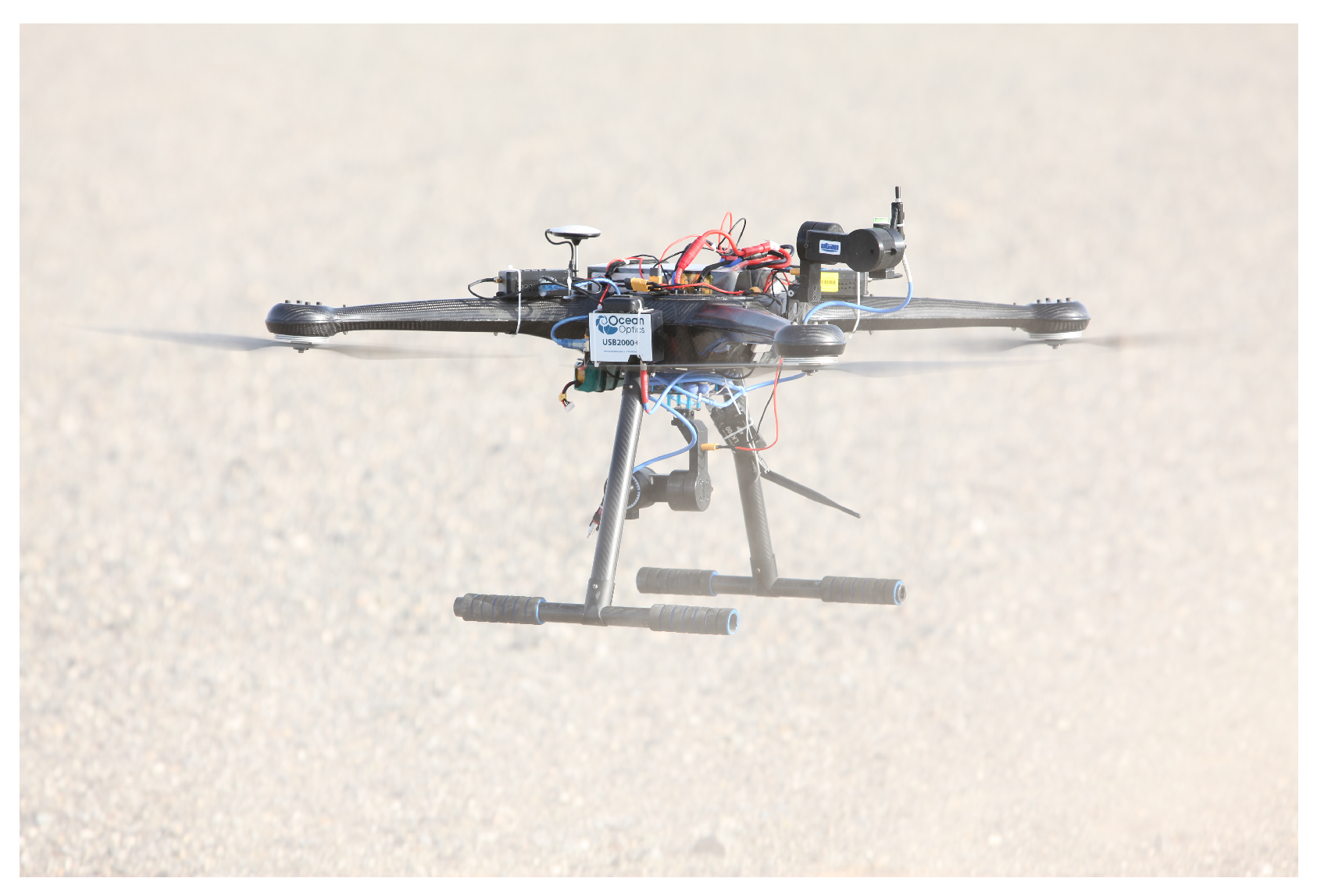 Figure 1). A custom-stabilized gimbal is mounted beneath the UAV to support nadir-oriented observations. The gimbal allows controlled pitch adjustment from
