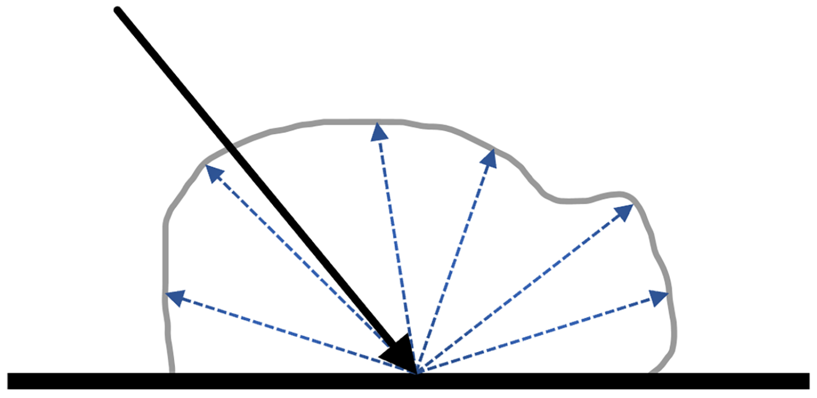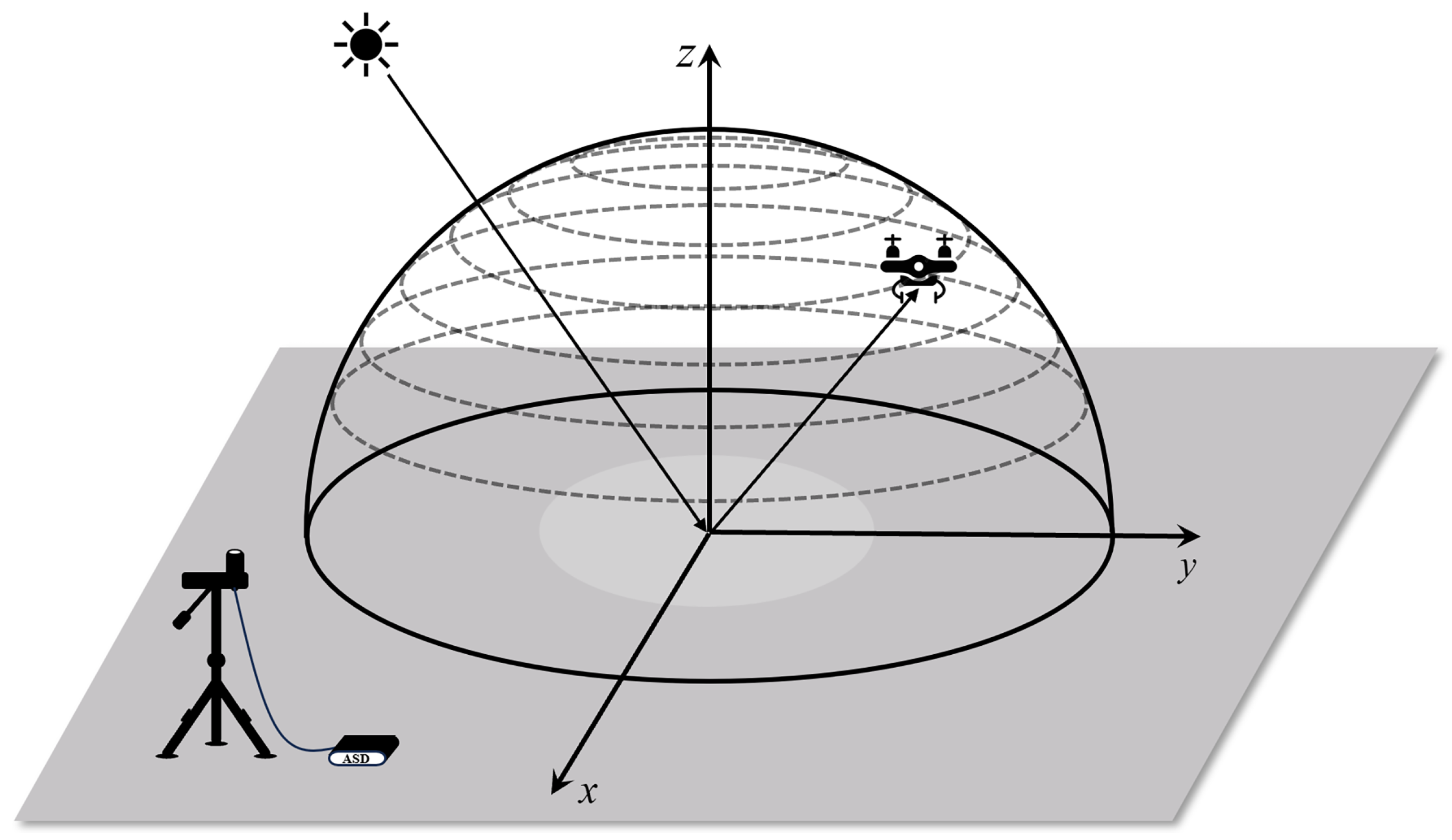 Under natural conditions, the surface is illuminated by the entire sky hemisphere, consisting of direct solar radiation, diffuse skylight, and contributions from the surrounding environment. Reflectance measurements acquired under such conditions are commonly expressed as the hemispherical–directional reflectance factor (HDRF), as illustrated in