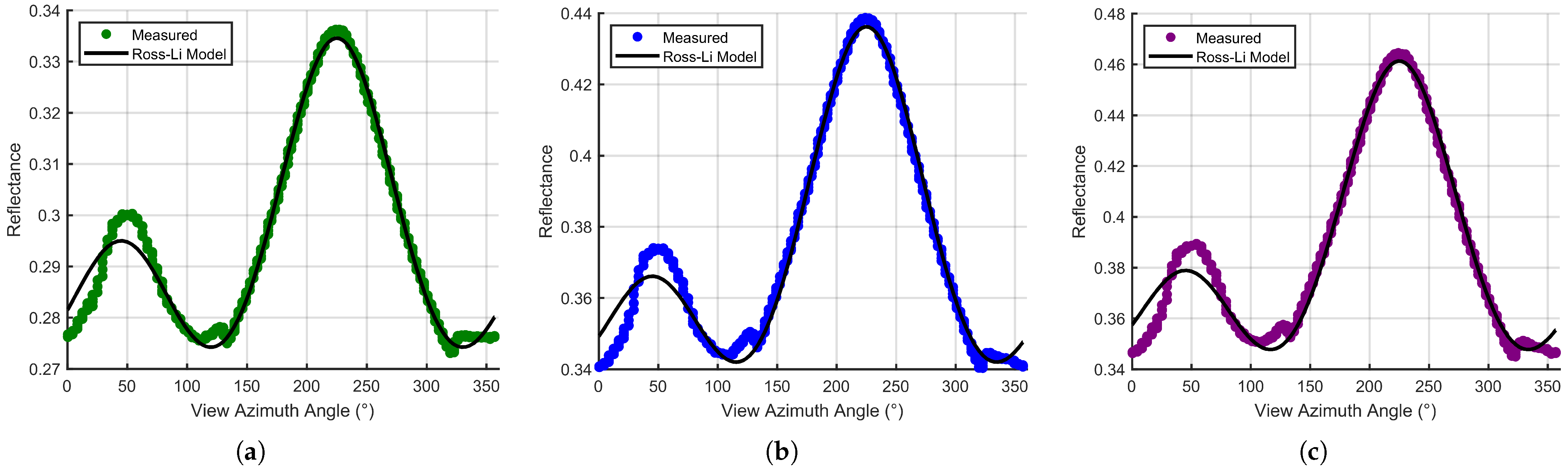 Figure 15 compares the measured azimuthal HDRF with the corresponding Ross–Li model predictions for the 500, 600, and 700 nm bands. The comparison is conducted at a fixed viewing zenith angle, with reflectance plotted as a function of absolute view azimuth angle. Overall, the Ross–Li model reproduces the dominant azimuthal variations in the measured HDRF with high fidelity across all three wavelengths.