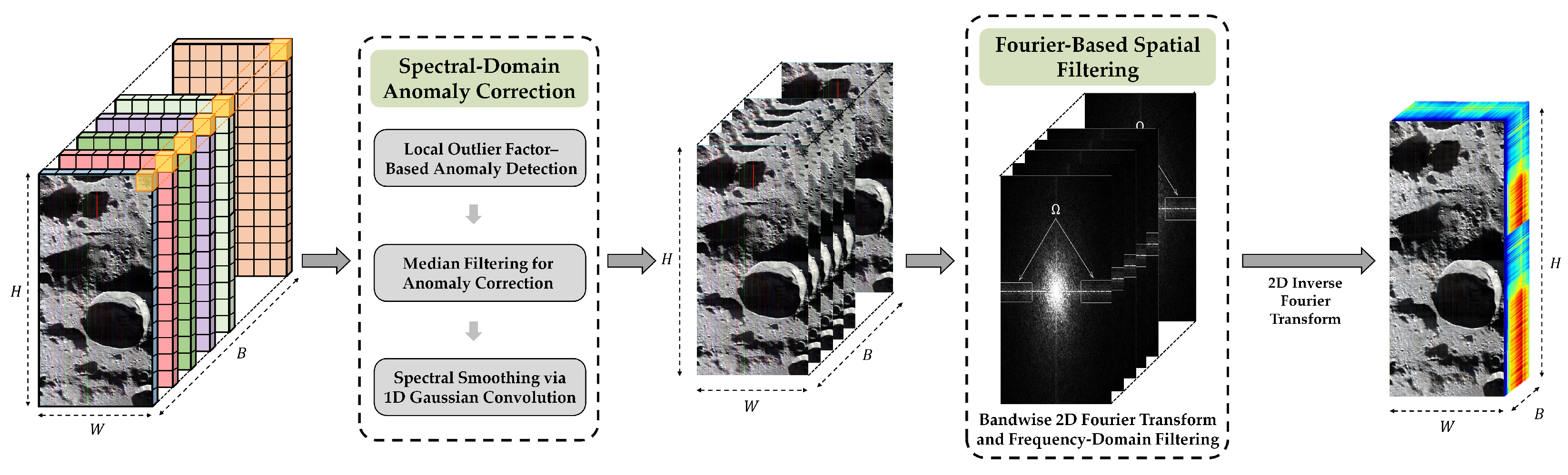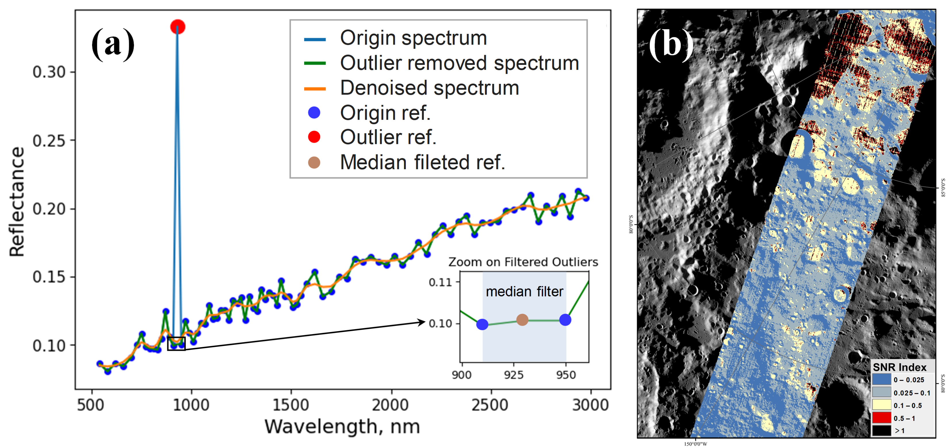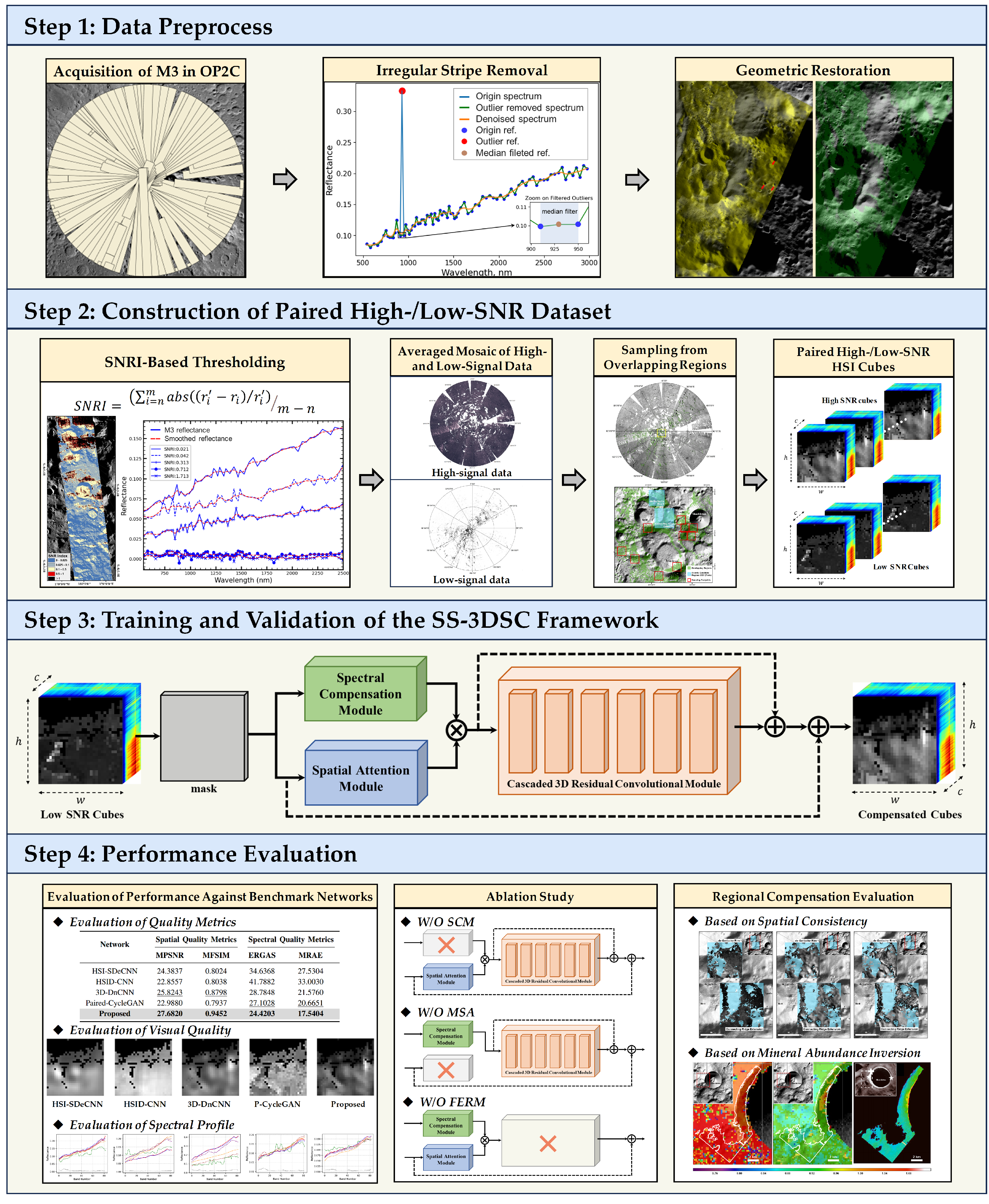 The fidelity of spectral signatures is paramount for the robust interpretation of HSI, particularly in lunar missions targeting objectives such as quantitative mineralogical mapping, hydroxyl/waterice abundance estimation, and elucidating geological evolution. Accurate spectral compensation is the cornerstone for discriminating the physicochemical properties of diverse lunar surface materials under low-illumination conditions, where attenuated signals compromise the spectral characteristics of shadowed terrain and PSRs near the lunar poles.