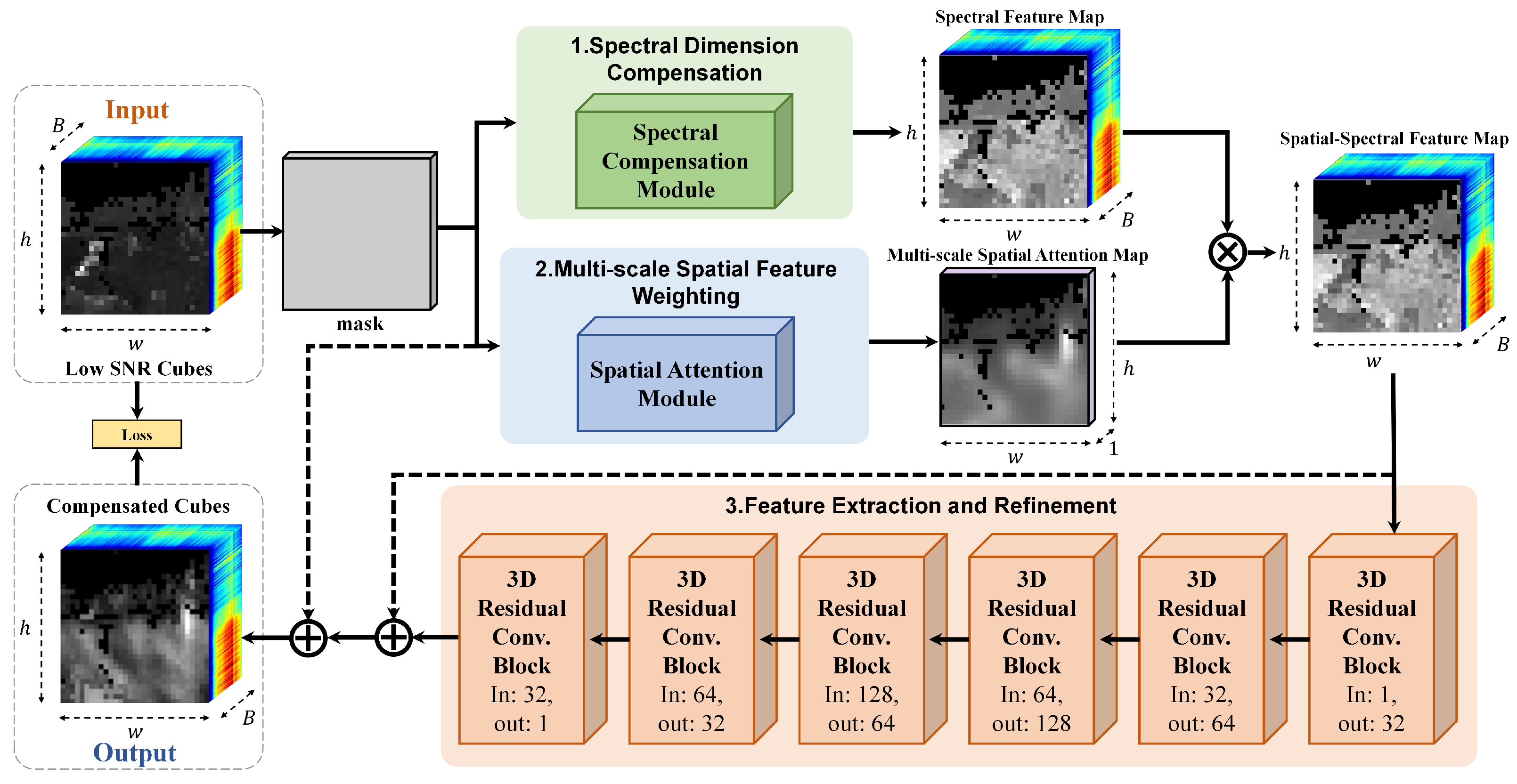 Dual-Branch Noise Compensation: A dual-branch module is proposed to decouple degradation characteristics and separate optimization pathways for spatial and spectral reconstruction, with joint spatial–spectral loss ensuring balanced fidelity across both domains.