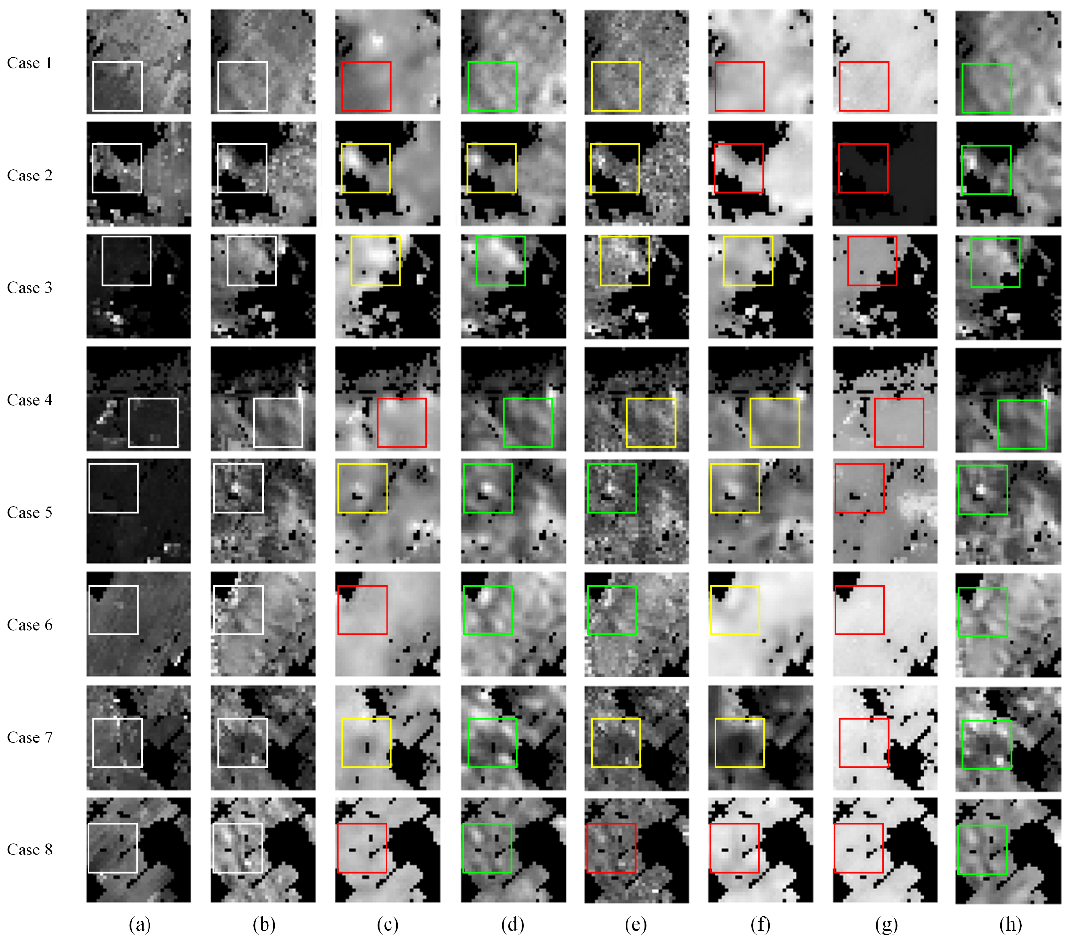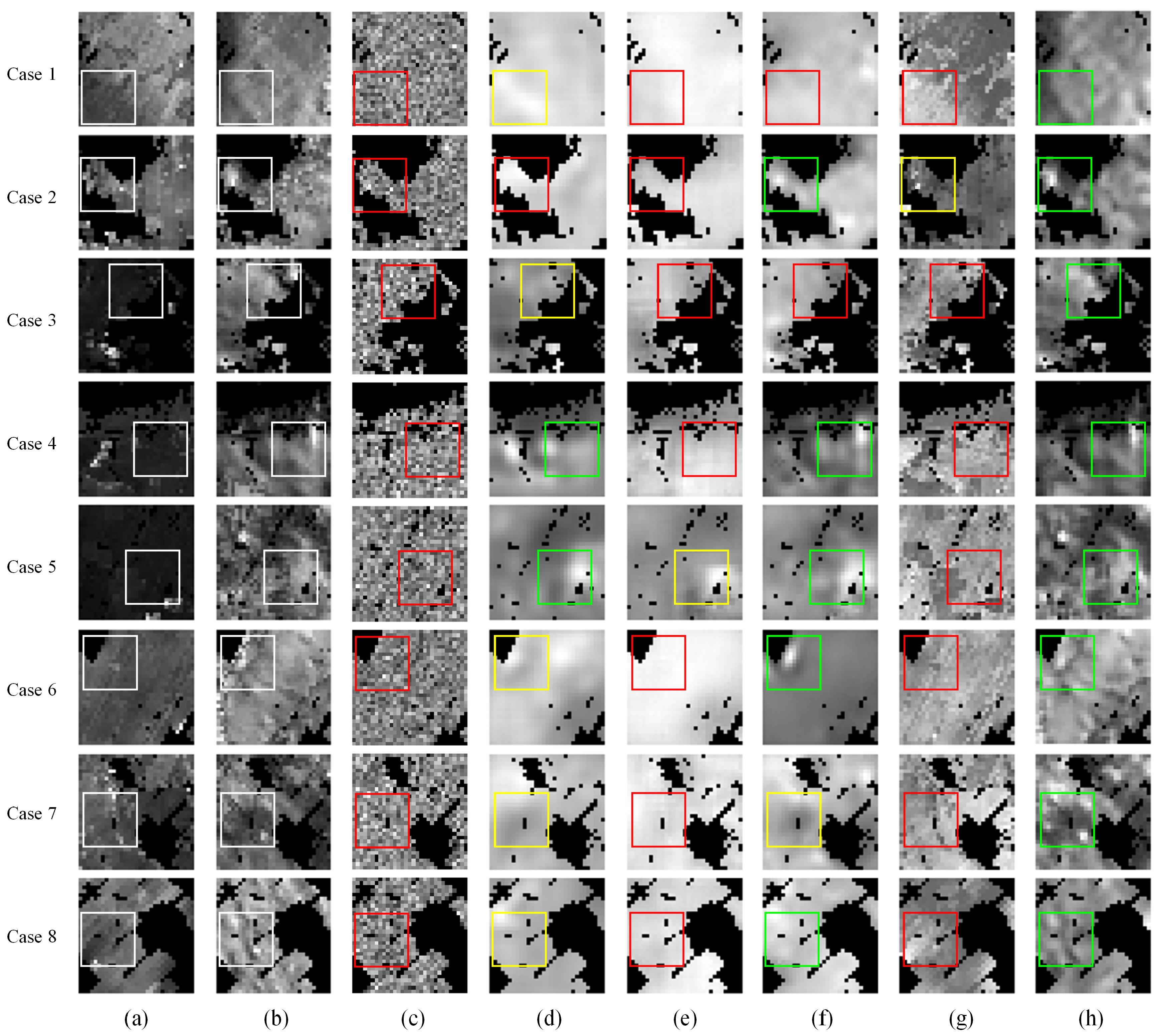 Figure 11c–h displays the resulting images obtained after applying different compensation methods. To facilitate systematic visual assessment, we annotate representative topographic features using colored bounding boxes. White boxes delineate salient geomorphological ROIs in the paired dataset. Colored boxes provide a qualitative guide to restoration quality: red indicates failure (no recognizable features), yellow indicates partial restoration (coarse structures without fine-scale texture), and green indicates successful restoration with preserved fine-grained morphology. It should be noted that this color coding serves solely as a visual guide and does not constitute a quantitative categorization; visual impressions should be interpreted together with the objective metrics in