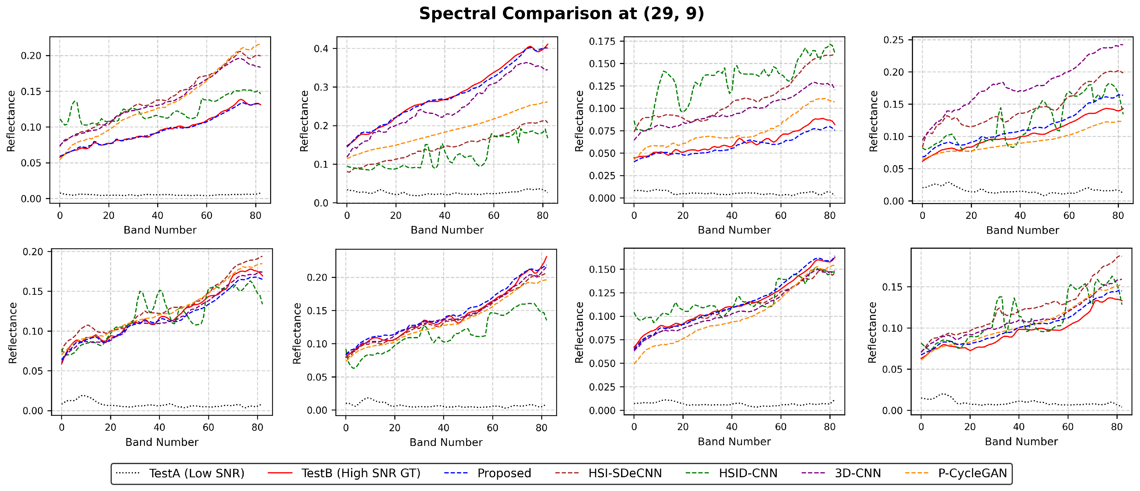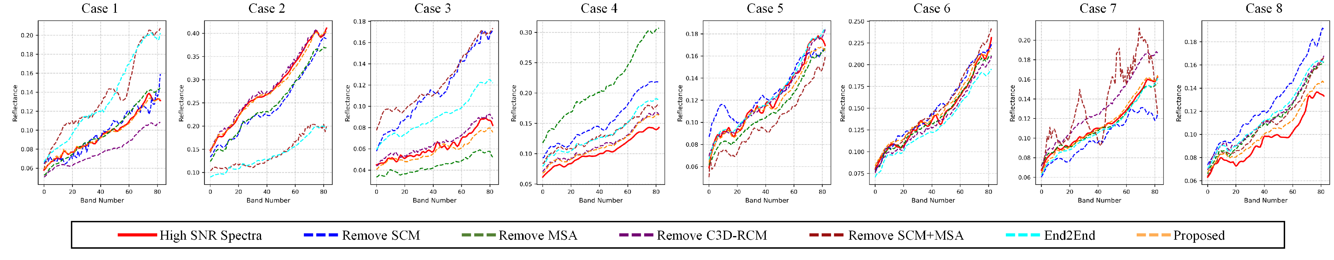 Section 4.1. As illustrated, the spectral profile compensated by the proposed network (blue dashed line) demonstrates the highest fidelity to the high-signal reference (red solid line). In contrast, all competing networks introduce varying degrees of spectral distortion, including the over or underestimation of overall reflectance levels, as well as the introduction of artificial fluctuations in spectral profiles. Specifically, HSID-CNN (green dashed line) exhibits pronounced spectral oscillations and spurious absorption bands; HSI-SDeCNN (brown dashed line) and 3D-DnCNN (purple dashed line) exhibit substantial deviations in spectral morphology and absorption band positions compared to the reference spectrum (e.g., Cases 2, 4, and 8), while simultaneously introducing systematic reflectance bias through over or underestimation (e.g., Cases 1, 3, and 4). Although paired-CycleGAN (orange dashed line) retains varying degrees of reflectance bias (Cases 1, 2, and 7), it significantly outperforms the aforementioned networks by delivering more accurate restoration of global spectral morphology and enhanced fidelity in local absorption band center recovery, thus representing the closest competing approach to our proposed SSF-3DSC. Such reflectance bias, however, is an inherent artifact of its single-pixel processing, which precludes the stabilizing influence of spatial regularization. In contrast, SSF-3DSC exploits spatial context from neighboring pixels to impose structural constraints that effectively suppress fluctuations in reflectance levels. The superior spectral fidelity achieved by SSF-3DSC relative to the purely spectral paired-CycleGAN underscores the critical role of spatial context in enabling robust hyperspectral signal reconstruction.